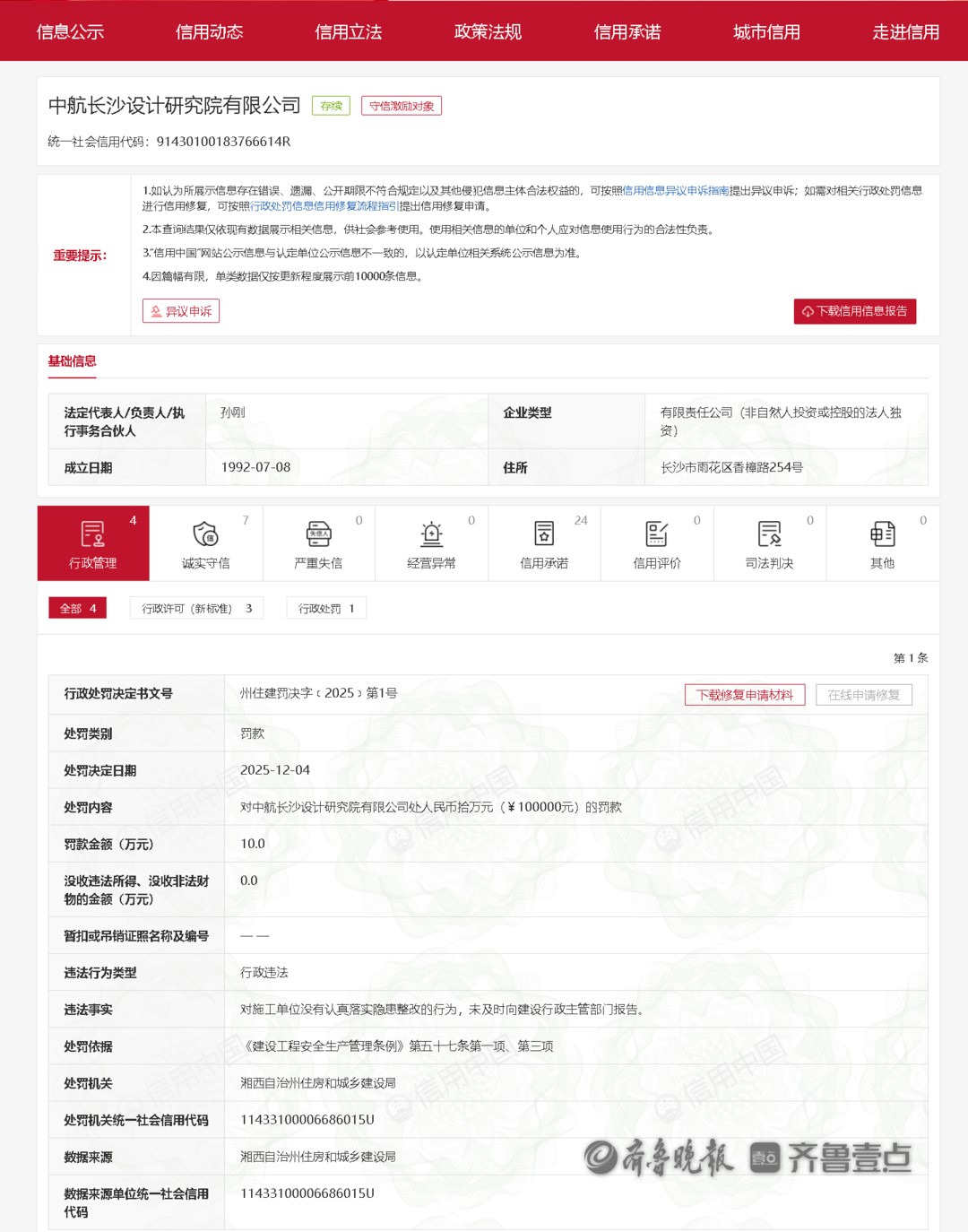 近日,齐鲁晚报·齐鲁壹点记者从信用中国获悉,中航长沙设计研究院有限公司因对施工单位没有认真落实隐患整改的行为,未及时向建设行政主管部门报告,被湘西自治州住房和城乡建设局罚款10万元。