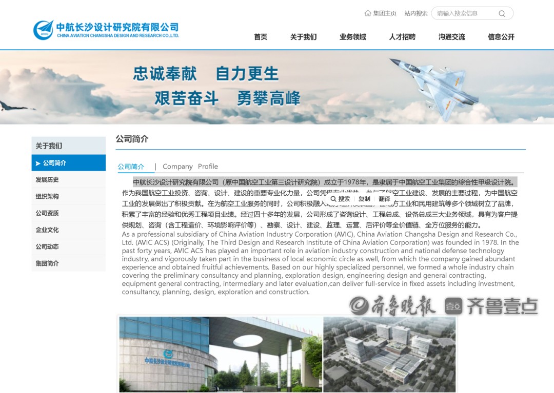 齐鲁晚报·齐鲁壹点记者从该公司官网了解到,中航长沙设计研究院有限公司(原中国航空工业第三设计研究院)成立于1978年,是隶属于中国航空工业集团的综合性甲级设计院。