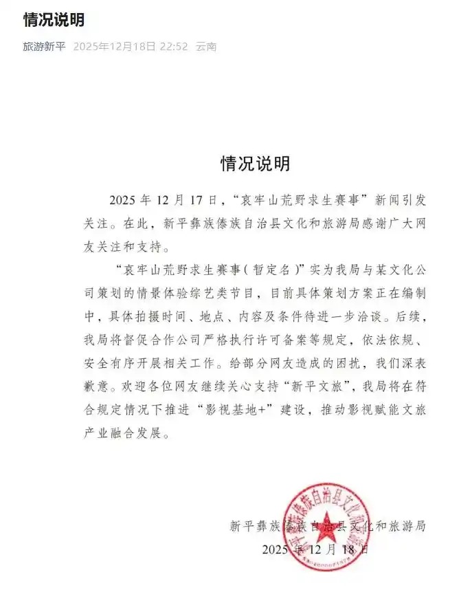 “哀牢山荒野求生赛事(暂定名)”实为我局与某文化公司策划的情景体验综艺类节目,目前具体策划方案正在编制中,具体拍摄时间、地点、内容及条件待进一步洽谈。后续我局将督促合作公司严格执行许可备案等规定,依法依规、安全有序开展相关工作。给部分网友造成的困扰,我们深表歉意。欢迎各位网友继续关心支持“新平文旅”,我局将在符合规定情况下推进“影视基地+”建设,推动影视赋能文旅产业融合发展。