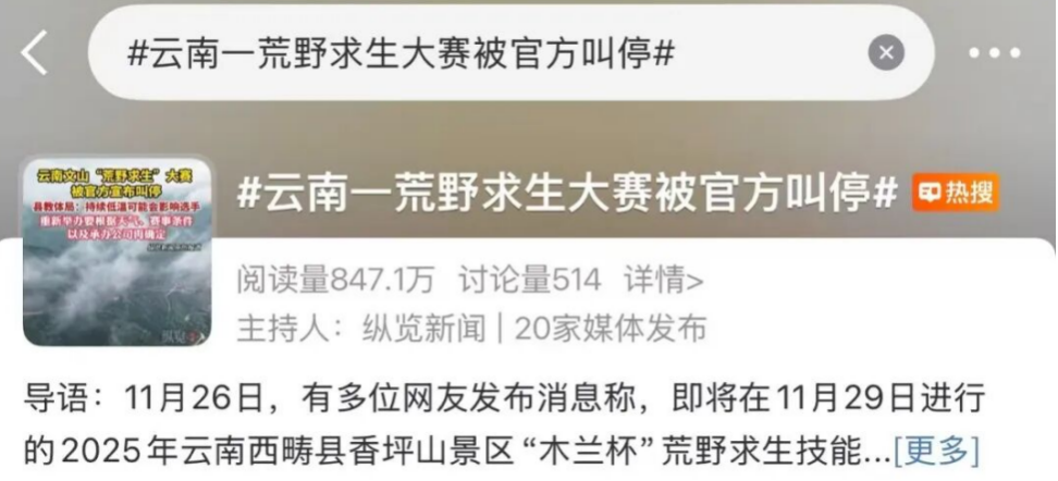 11月26日,有多位网友发布消息称,原定于11月29日进行的2025年云南西畴县香坪山景区“木兰杯”荒野求生技能大赛被紧急叫停。