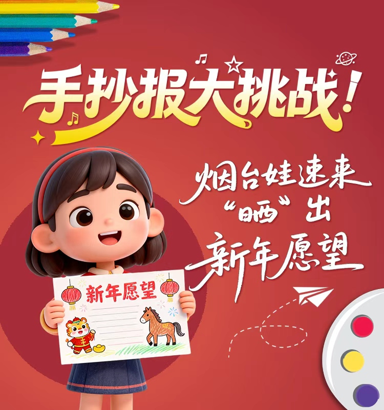 无论你是擅长绘画的“小艺术家”,还是热爱表达的“小作家”,都可以拿起画笔、铺开画纸,用丰富的想象力和创造力,将新年愿望、元旦习俗、成长规划或是对烟台的美好祝福,统统绘进手抄报里,让这张小小的纸片,成为2026年最珍贵的开篇纪念!