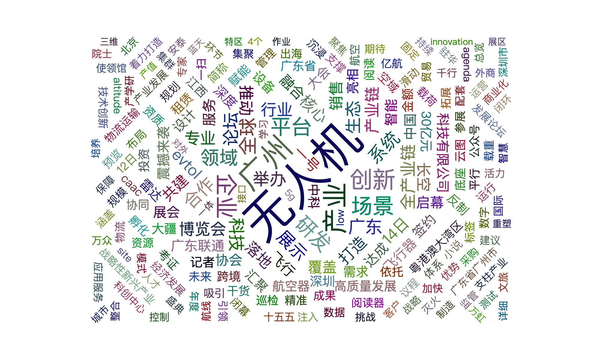 词云图可以反映传播内容的聚焦点及其与活动主题的契合情况。有关广州低贸会的全网传播内容词云图如下,其中关键词“无人机”的提及量排名第一,提及次数为2616次;关键词“广州”的提及量排名第二,提及次数为1435次;“产业”的提及量排名第三,提及次数为1152次。此外,“创新、企业、场景、平台、研发、全球、领域”等都是提及量排名前十的热词。