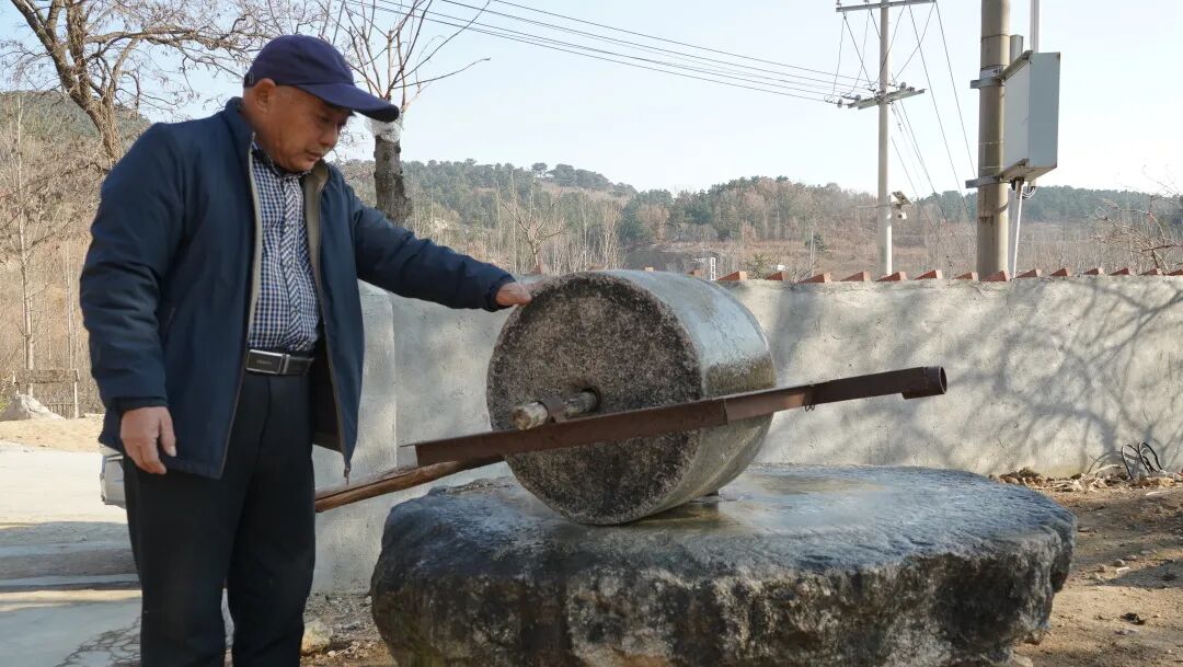 刘洪恩站在磨盘旁回忆三十年前带着煎饼上山架线施工的场景。从腊月廿十到廿九,每一天都是与山的较量。60基水泥杆、5公里线路,机械无用武之地,全靠人力。沉重的电杆压在肩头,木杠吱呀作响,号子声从胸腔迸发,在山谷间沉重地回荡。