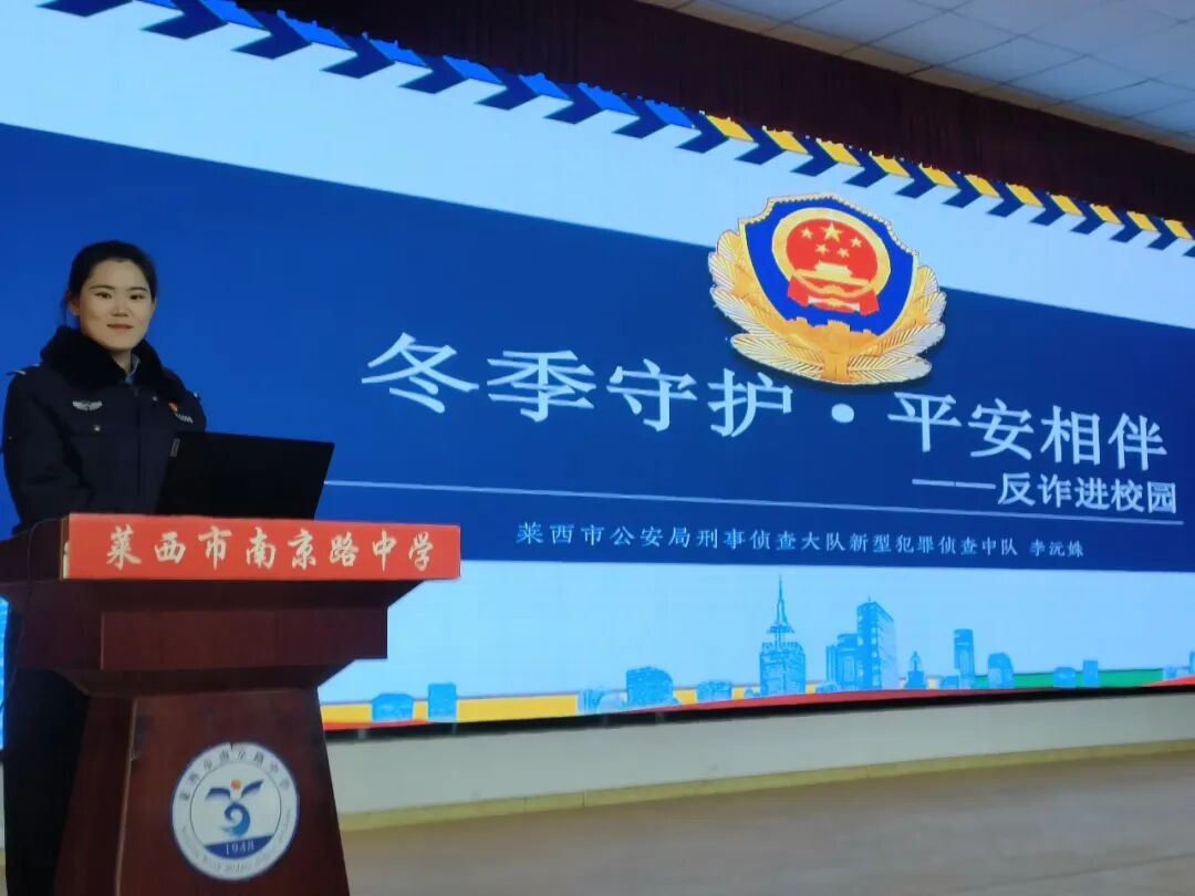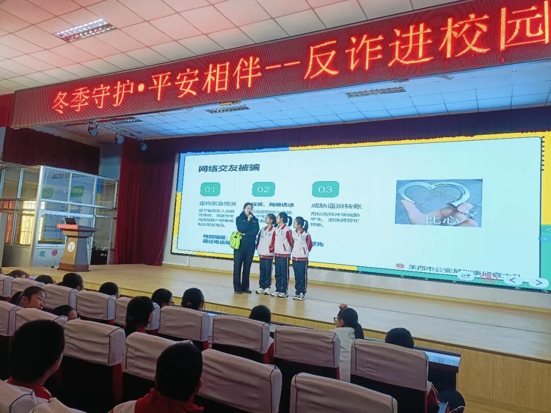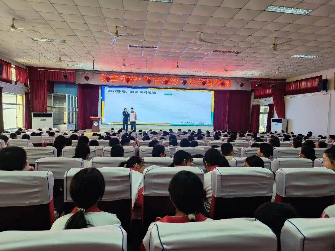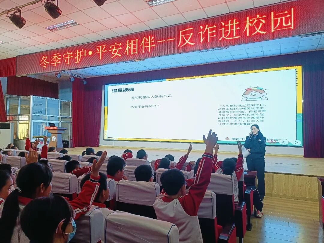“如果有人告诉你可以低价充值游戏货币、免费领取游戏皮肤,如果有人让你的爷爷奶奶参与社会养生免费讲座和购买各种保健品,不要轻易相信他们,因为他们极有可能就是骗子……”民警李沅姝摒弃枯燥说教,紧扣学生关注的游戏账号交易、追星打榜、网络兼职等话题,结合真实案例,用诙谐幽默的语言向同学们讲述诈骗分子如何实施诈骗行为及电信诈骗的危害,深入浅出地为同学们剖析了各类电信网络诈骗的手段特点,并声情并茂的教授同学们应对防范诈骗的方式方法,同时提醒同学们在日常生活中要提高警惕,如遇可疑情况,要多和家人、老师沟通商议或及时报警,做到“不点击未知链接、不轻信陌生来电、不透露个人信息”。
