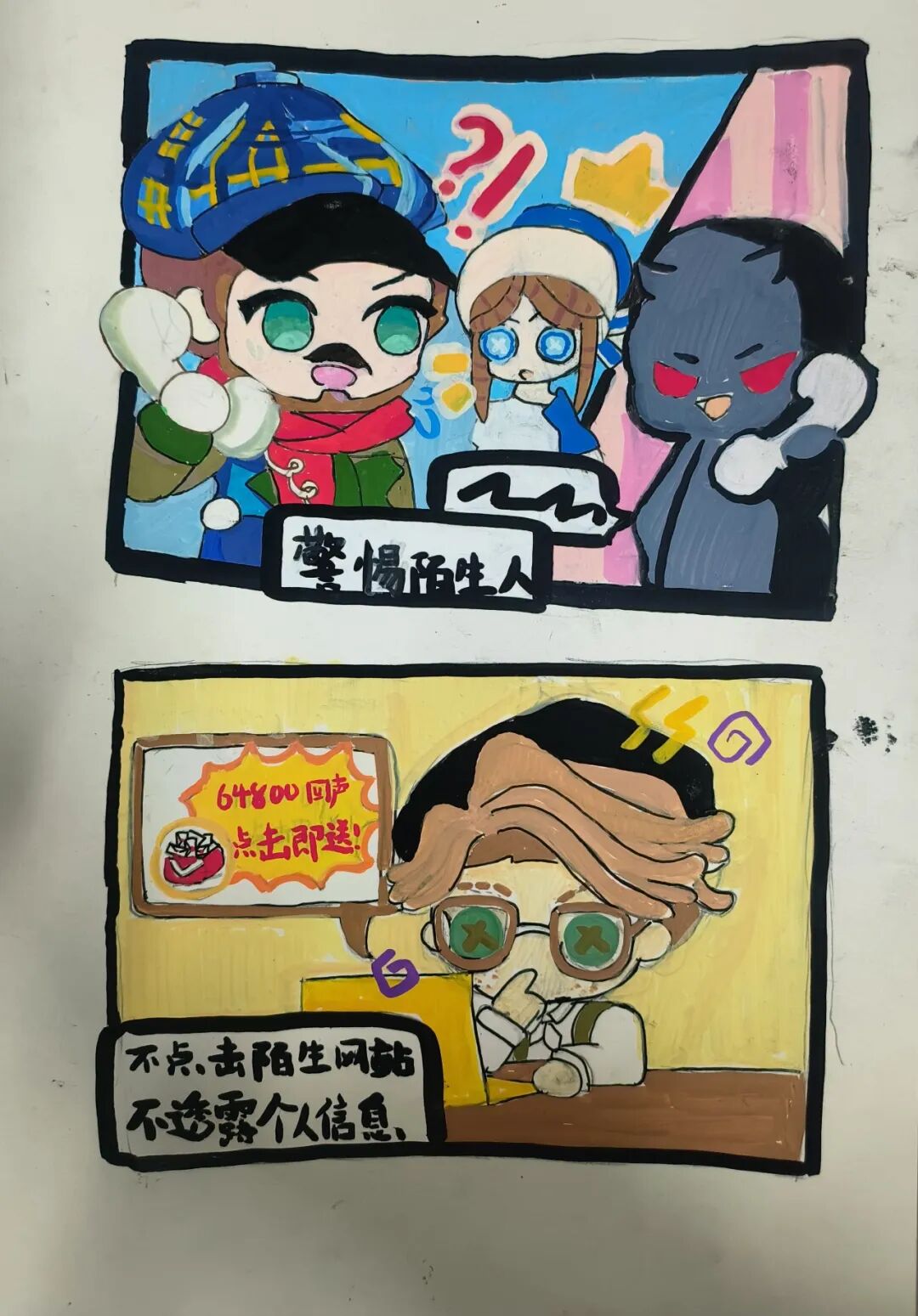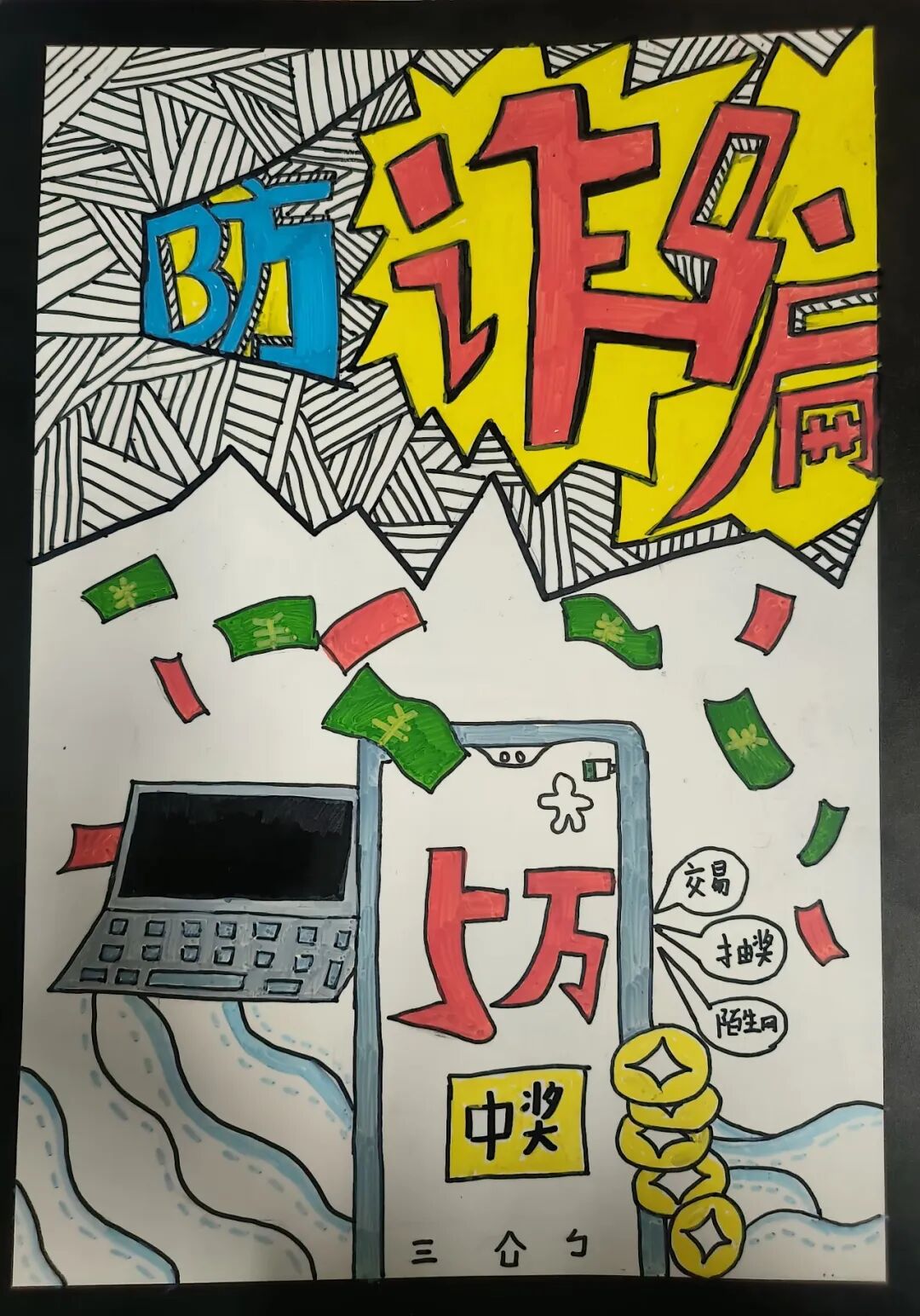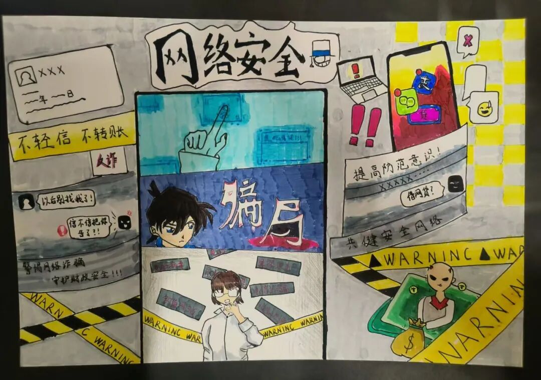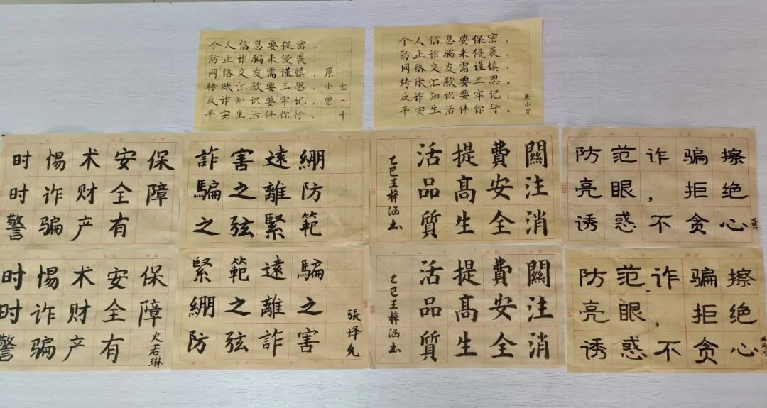 “防范诈骗擦亮眼,拒绝诱惑不贪心”“紧绷防骗之弦,远离诈骗之害”“不点击陌生网站,不透露个人信息”……活动期间,民警号召爱好书法、绘画的同学用纸笔创作反诈书画作品,鼓励同学们在学习和生活中努力做一名反诈宣传小使者,得到了同学们的积极响应。书法爱好同学们热情高涨,挥毫泼墨,创作出一幅幅寓意深刻的反诈书法、绘画作品,将平常入脑、入心、入行的反诈知识写出来、画出来。此次活动以艺术为载体,将反诈知识与书画创作相结合,吸引了学生的广泛参与,让更多学生在欣赏书画之美的同时,牢记反诈知识,绷紧防范之弦,共同守护校园安全。