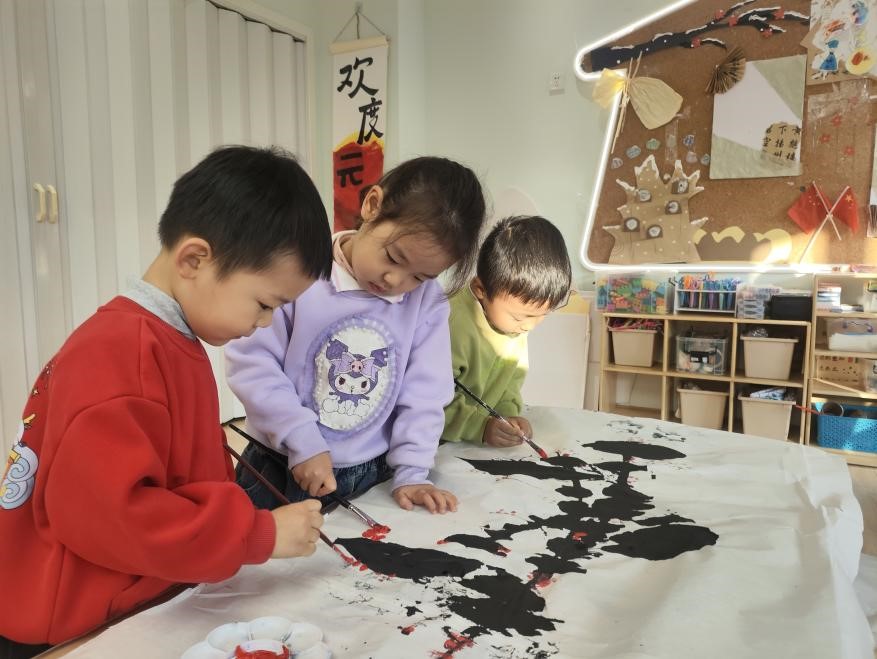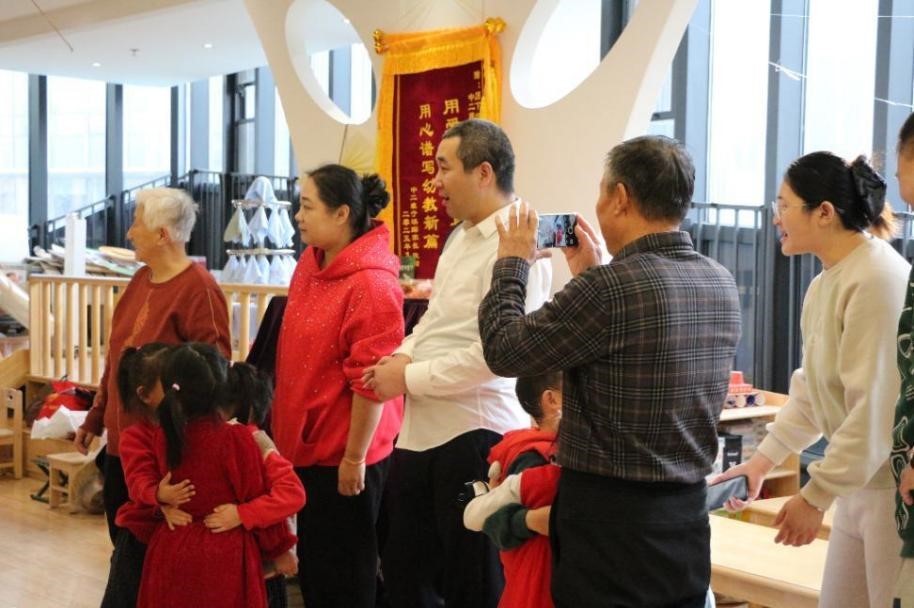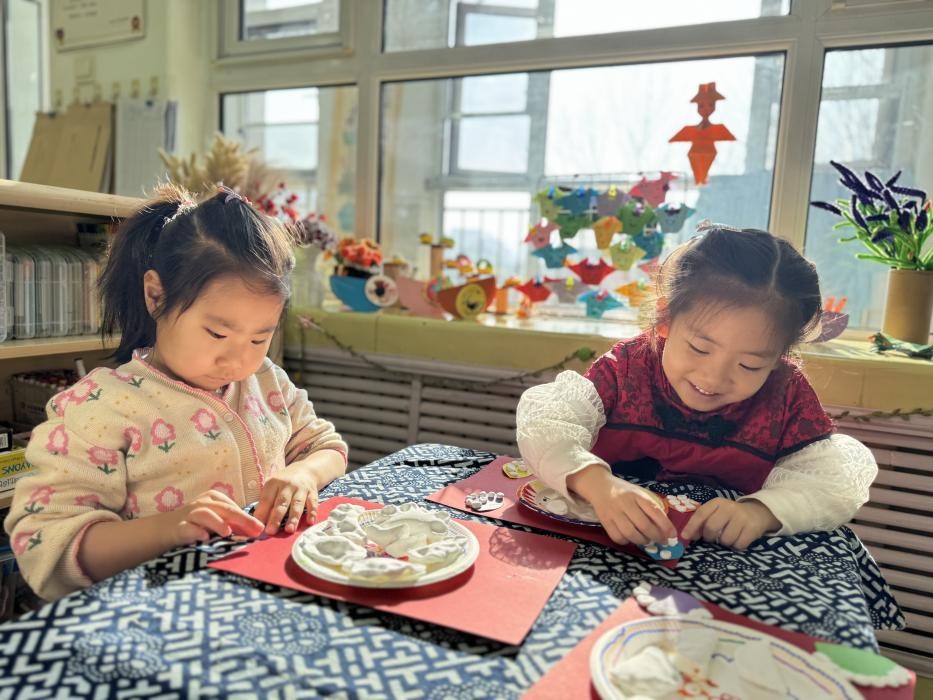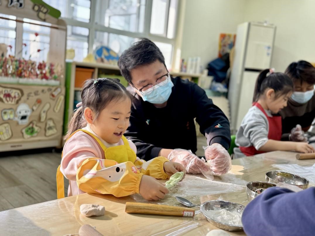 手工区里,孩子们用彩泥捏饺子、树枝做梅花;家长入园携手孩子制作冬至挂饰,亲子游戏与手工创作的欢声笑语,让教室满是温情。