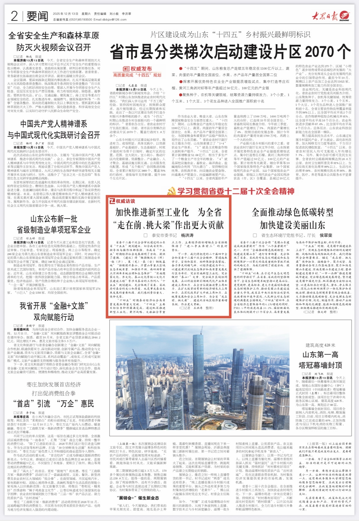 12月13日,2版要闻“学习贯彻省委十二届十次全会精神•权威访谈”专栏专访泰安市委书记杨洪涛,刊发杨洪涛书记署名文章《加快推进新型工业化 为全省“走在前、挑大梁”作出更大贡献》。详情请点击这里——
