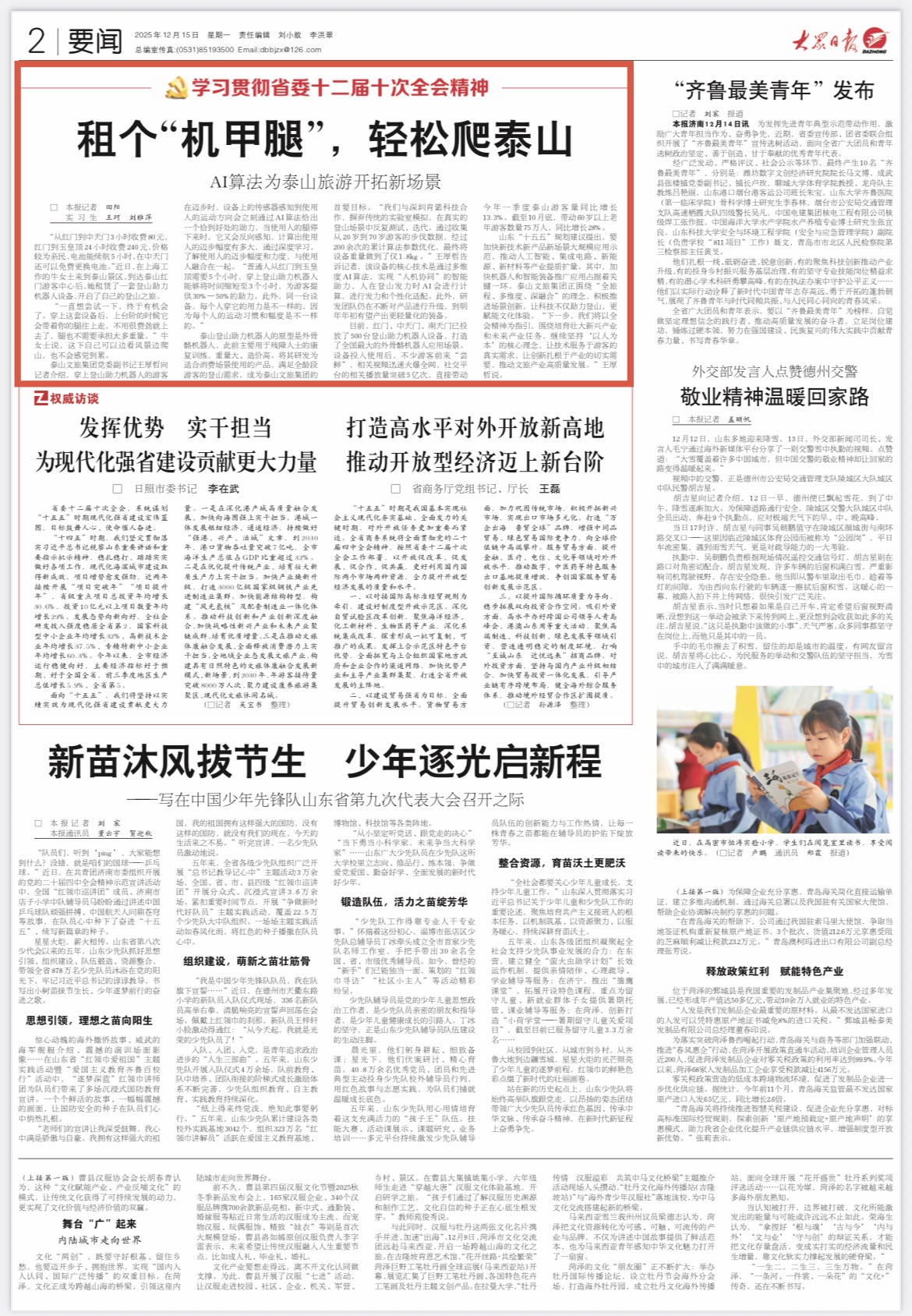 12月15日,2版要闻“学习贯彻省委十二届十次全会精神”专栏刊发《租个“机甲腿”,轻松爬泰山》,报道AI算法为泰山旅游开拓新场景。详情请点击这里——
