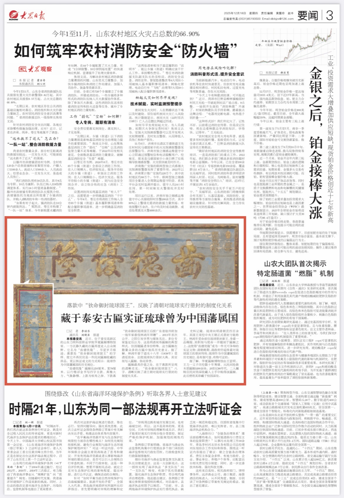 12月18日,3版要闻刊发《藏于泰安古匾实证琉球曾为中国藩属国》,报道位于泰安高新区的山东力明科技职业学院华夏匾额博物馆里,一方古匾走入公众视野,昭示琉球作为中国藩属国的历史地位。详情请点击这里—
