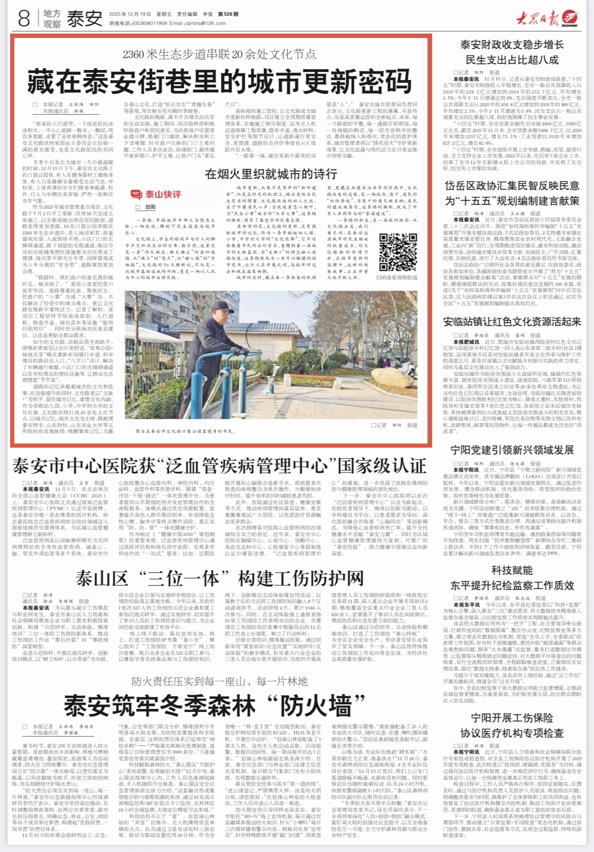 12月19日,《大众日报•泰安新闻》推出重磅策划《藏在泰安街巷里的城市更新密码》,报道泰城文化路开工更新,仅用56天完成主体施工,以全新面貌出现在居民眼前。详情请点击这里——