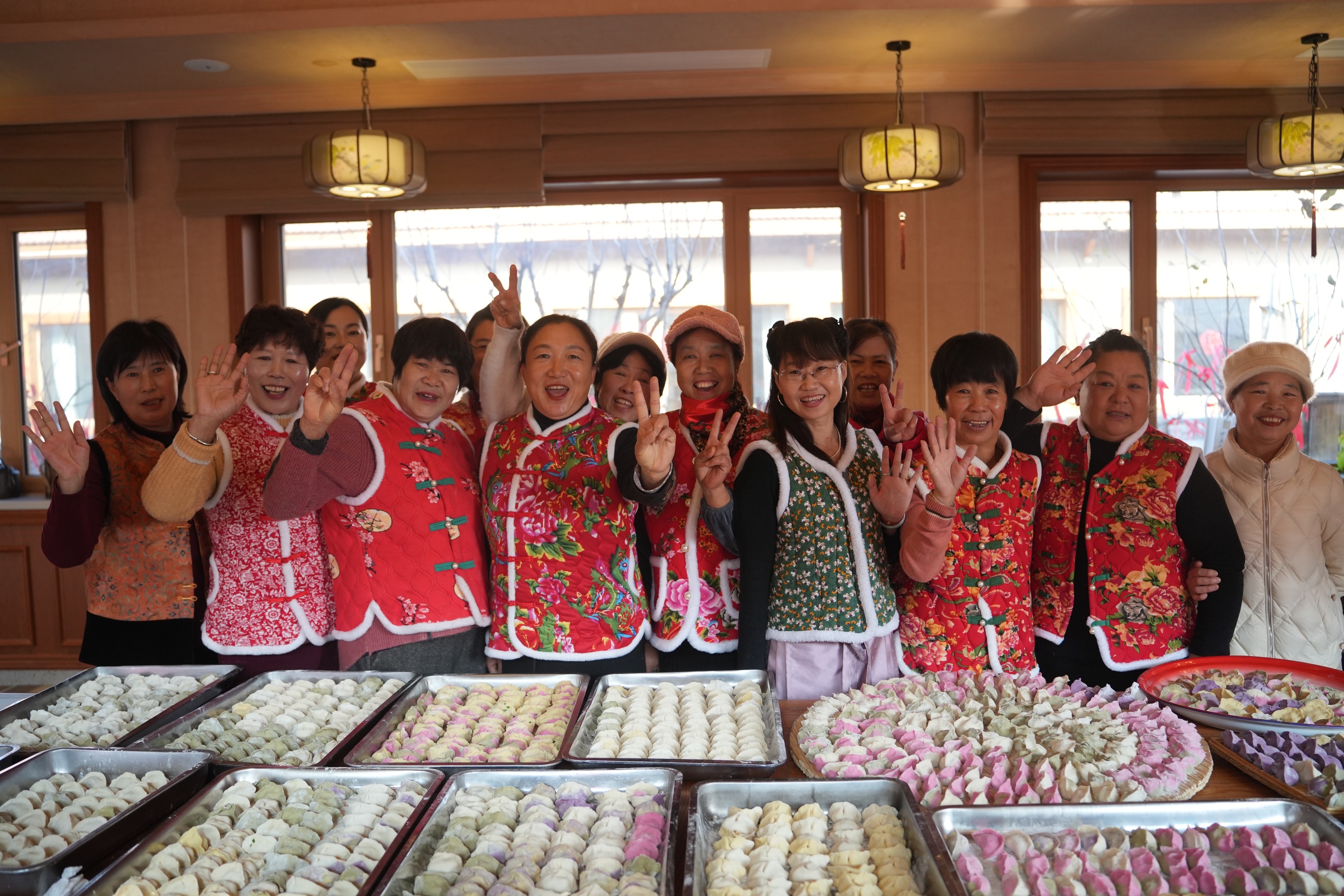 揉面团、调馅料、擀皮儿、捏褶子......动作娴熟流畅,欢声笑语间,猪肉的鲜香与大白菜的清甜在空气中交织,不一会,托盘里就整整齐齐摆满了一个个饱满的“元宝”。