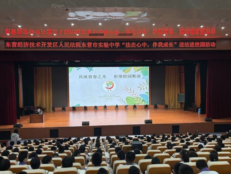 12月18日下午,东营市实验中学联合东营经济技术开发区人民法院共同举办了一场以“法在心中,伴我成长”为主题的送法进校园活动。活动由东营市实验中学安保处主任胡尊祥主持。开发区法院法官郑文超受邀为全校师生带来一堂生动深刻的法治报告。