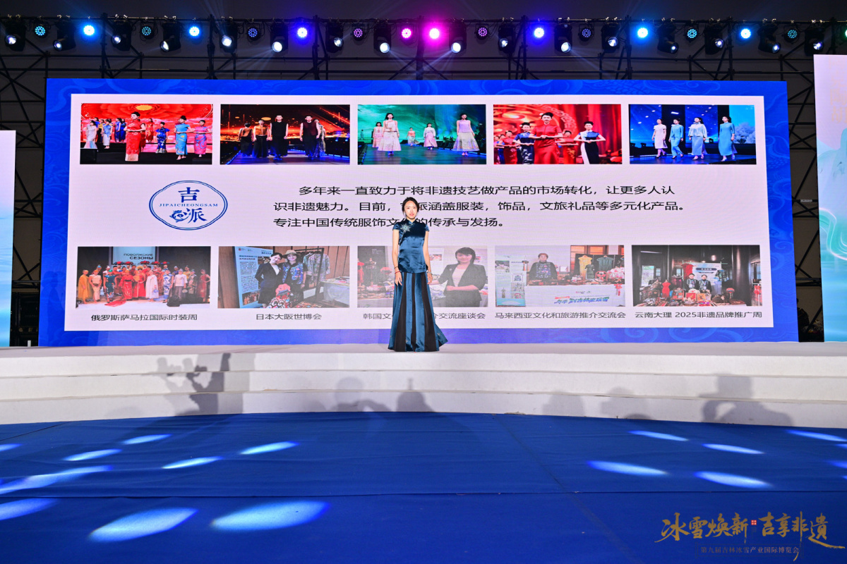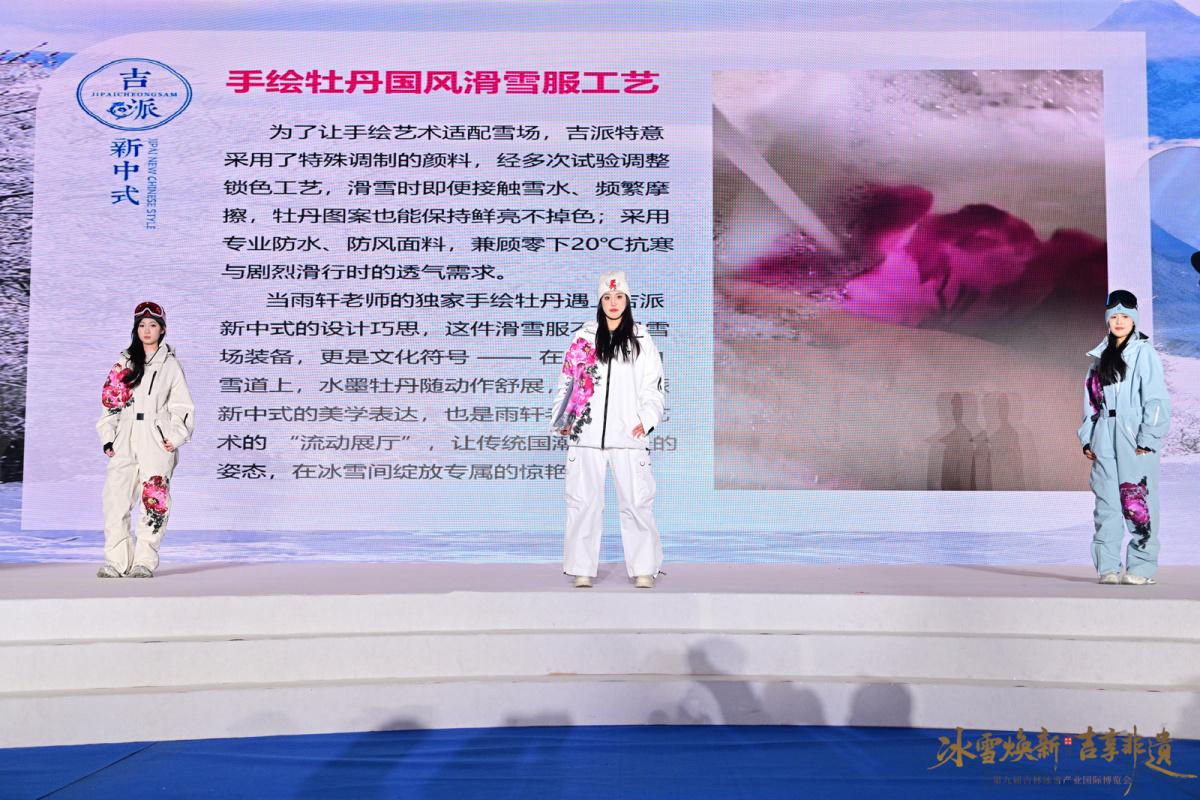 在创新融合展示环节,活动集中推介了“冰湖腾鱼”等一批具有市场潜力的吉林非遗品牌,同时融合了满族传统刺绣工艺、满族十八镶滚传统制作工艺、满族荷包(旗袍配饰)三项非遗技艺的“吉派”品牌也在现场发布了与画家丁宇、书法家王心明的合作创作的新品雪服。