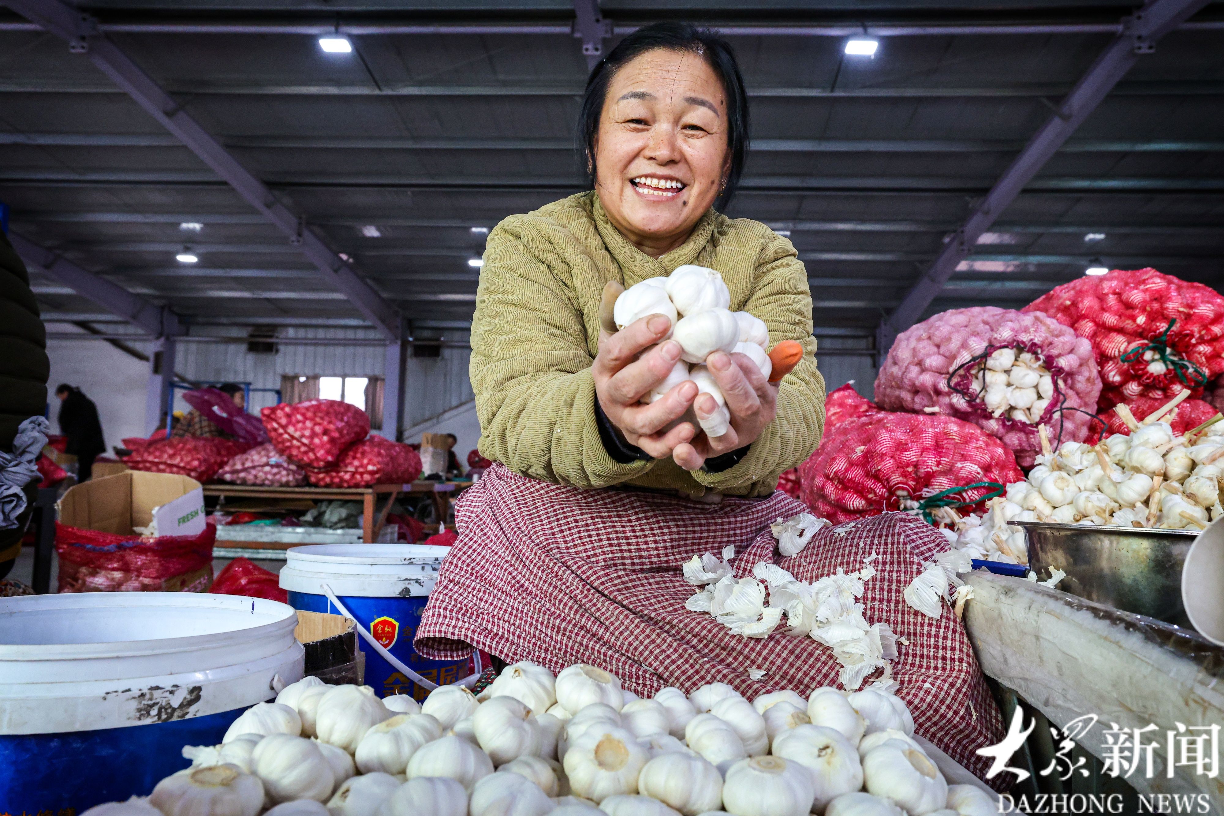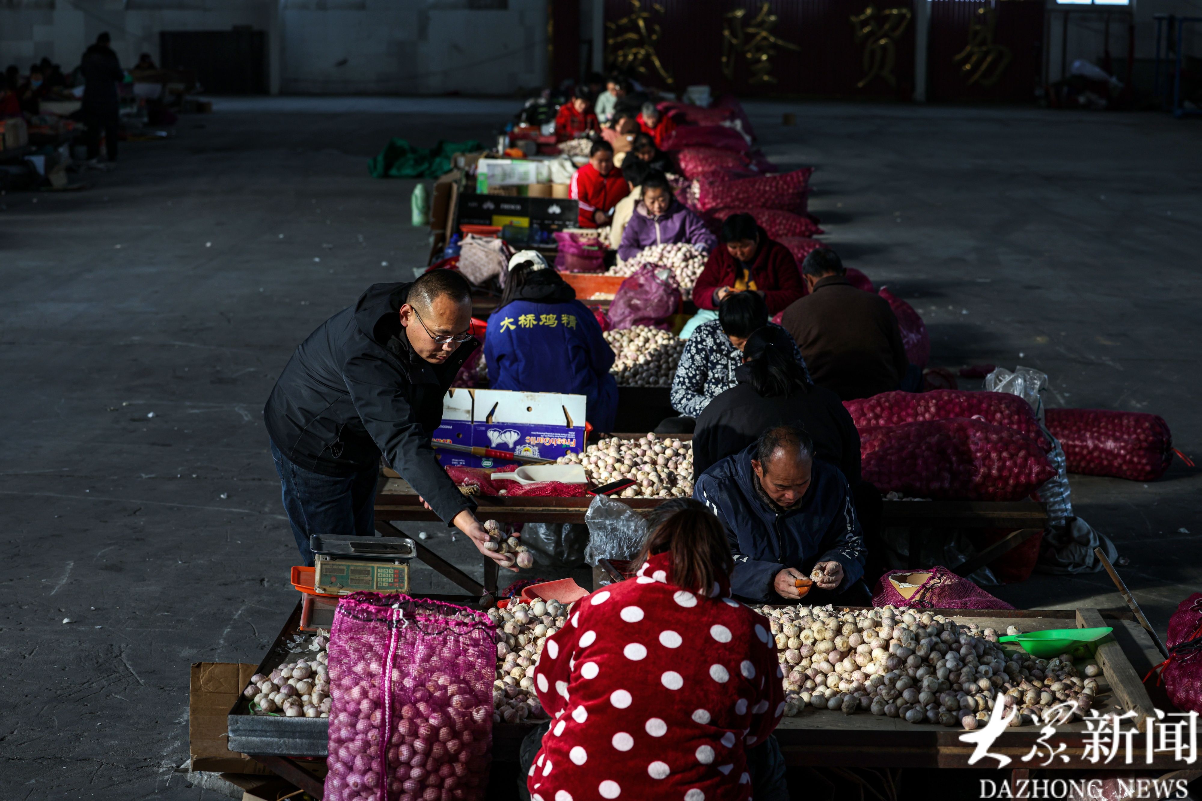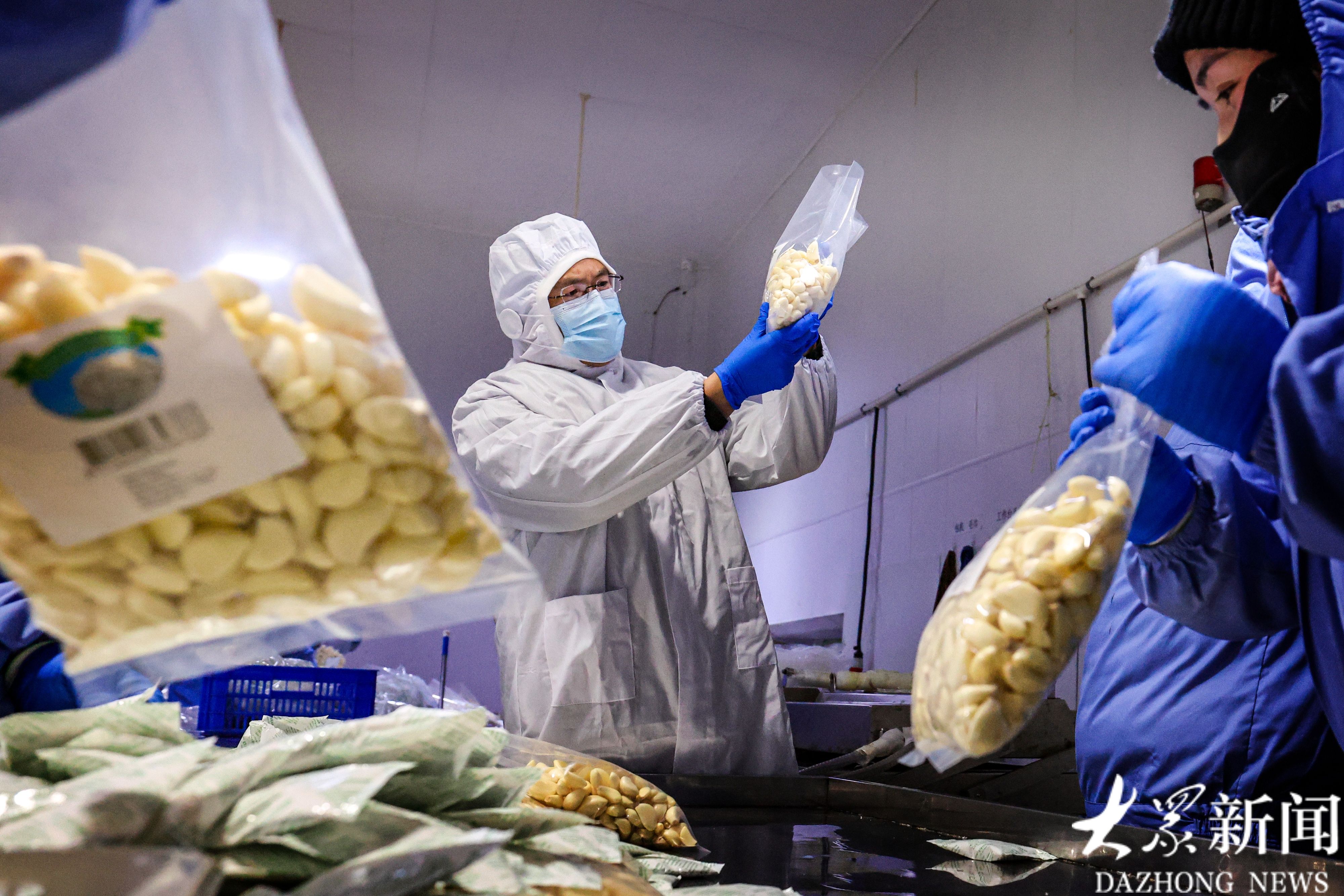 12月10日,温永攀在初加工车间查看大蒜的加工进度。