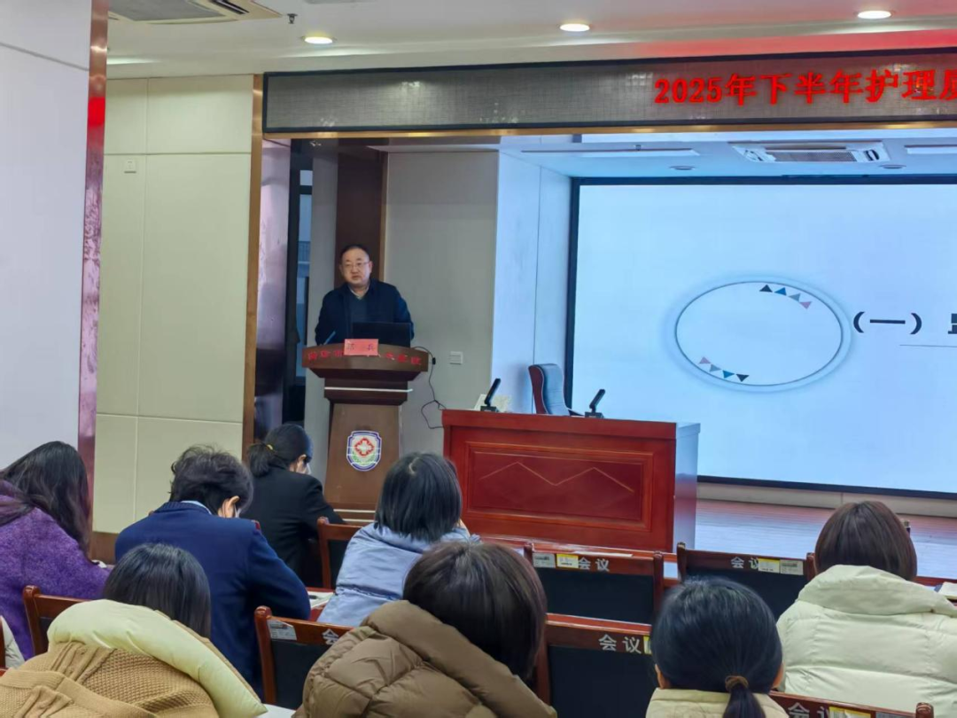 医院分管领导邵兵出席会议并作总结指导讲话。他充分肯定下半年护理团队的努力与成绩,赞赏护理部运用数据管理、推动跨部门协作的举措。强调护理质量安全的重要性,提出四点工作要求:以“零容忍”严抓查对制度执行;以“精细化”落实分级护理制度;以“有温度”夯实基础护理质量;以“有效性”深化健康宣教内涵。