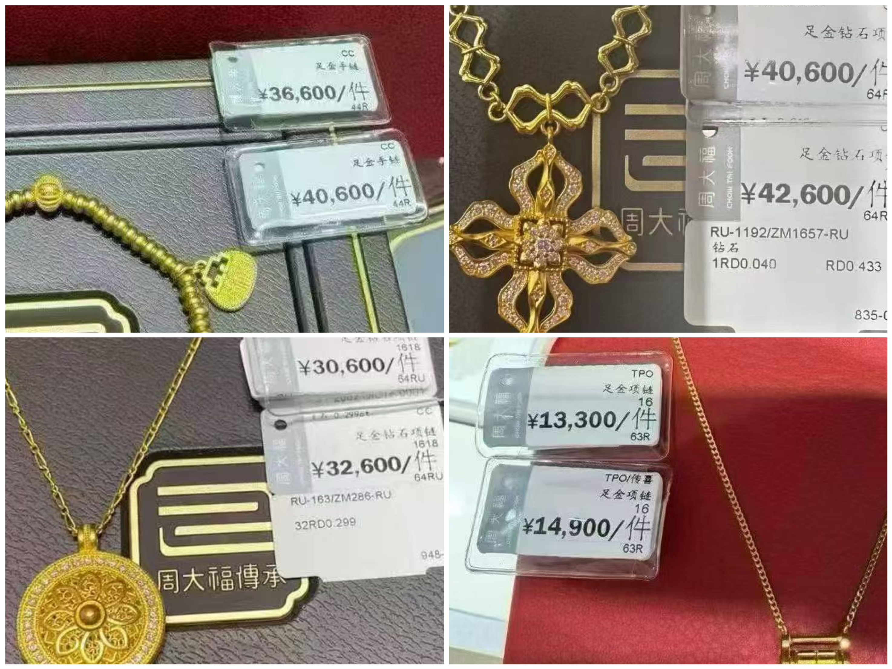 记者了解到,一件古法金工艺的手串原价为36600元,涨价后价格为40600元,涨了4000 元,涨价幅度约为10.93%。一件镶钻的黄金项链原价为40600元,涨价后为42600元,涨了2000元,涨价幅度为4.93%,一件八宝罗盘的黄金套链,原价为30600元,涨价后价格为32600元,涨价幅度为6.54%。