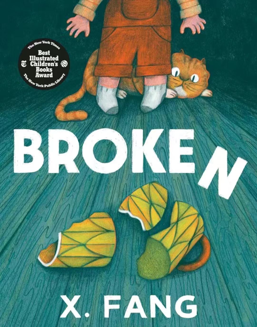 另一本华人创作的图画书《碎了》(Broken),讲述小女孩美美不小心打碎了阿嬷最爱的杯子,无辜的小猫咪咪成了“替罪羊”。但咪咪委屈的眼神让美美内疚,最后她选择坦白事实,也得到了阿嬷原谅的拥抱。