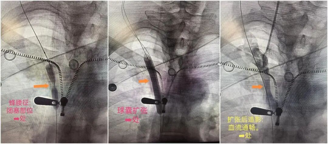 首先使用8mm球囊进行初步扩张,随后更换10mm球囊进行多次扩张。在扩张过程中,可见明显的“蜂腰征”,表明闭塞部位病变较重。