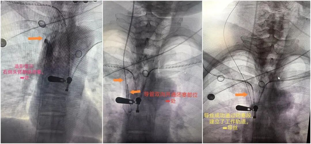 团队穿刺右侧股静脉,置入血管鞘管,尝试将导丝通过闭塞段。然而,DSA造影显示右侧头臂静脉汇入上腔静脉处完全闭塞,闭塞段较坚韧。