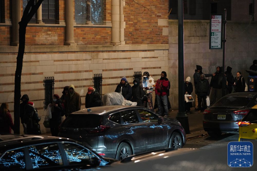 12月17日,在美国纽约曼哈顿的一处救助点,人们排队等待领取免费晚餐。 新华社