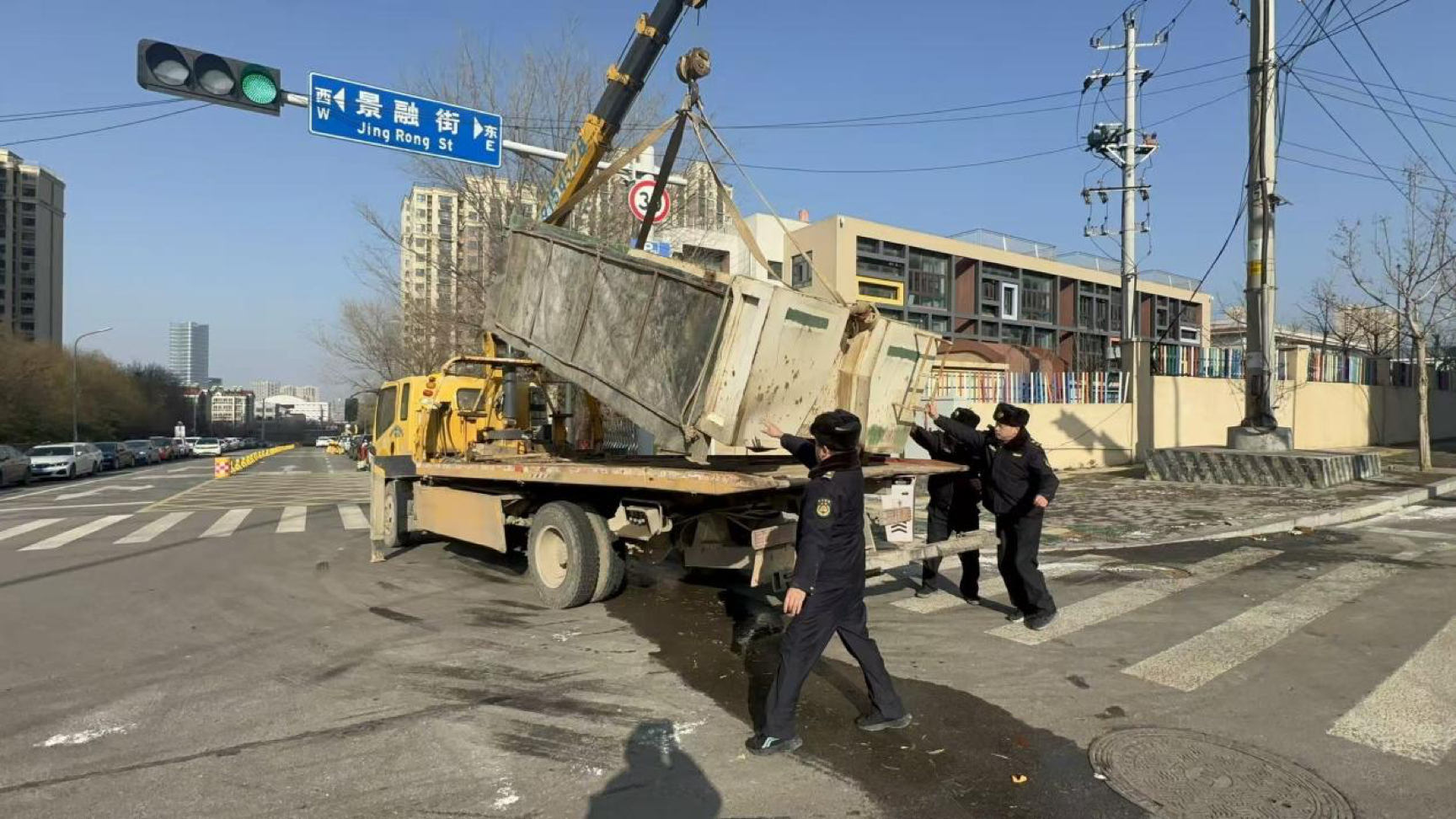 城管执法人员和交警人员第一时间联系相关单位,细致宣讲占道停放的危害及相关法律法规。为确保学生和市民出行环境安全有序,街道城管委立即协调吊车,对违规占道车斗进行挪移,有效消除道路通行隐患。