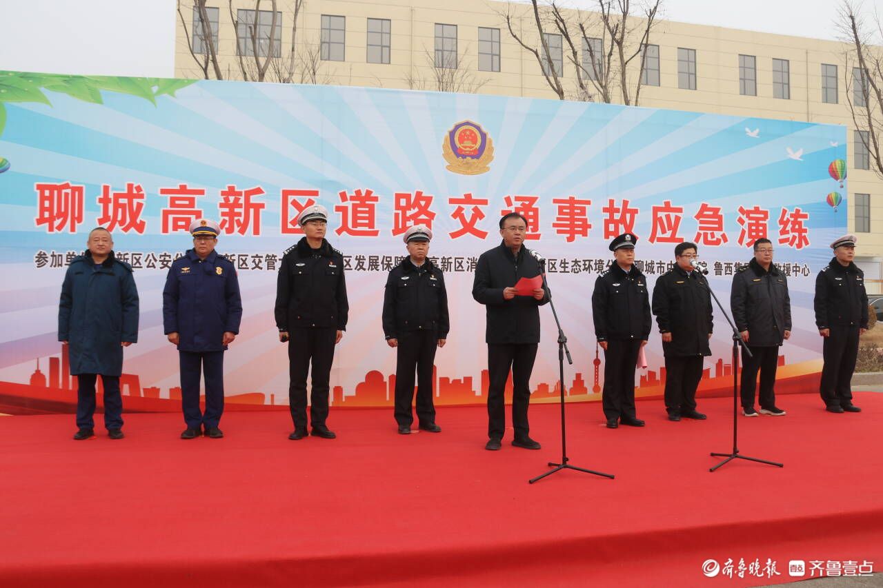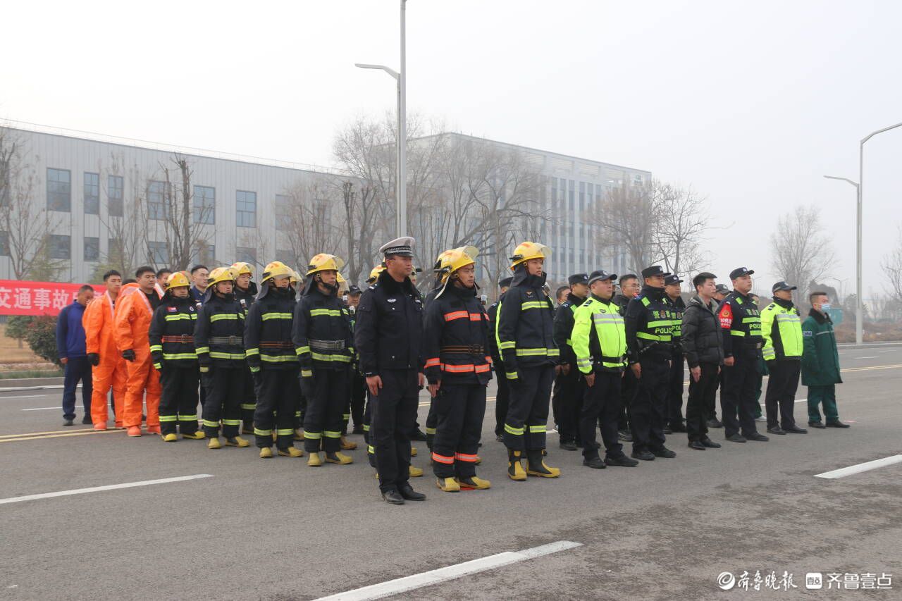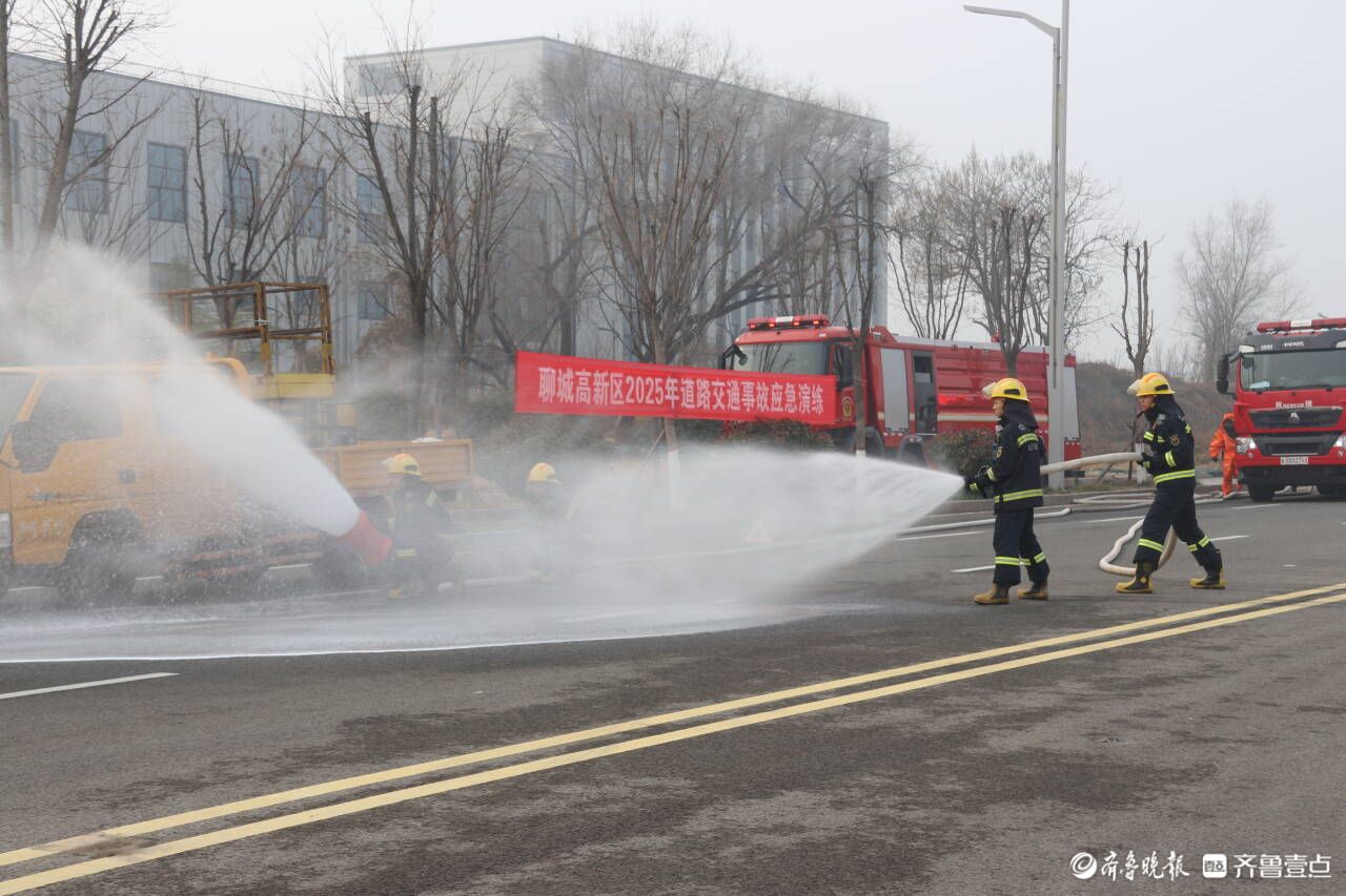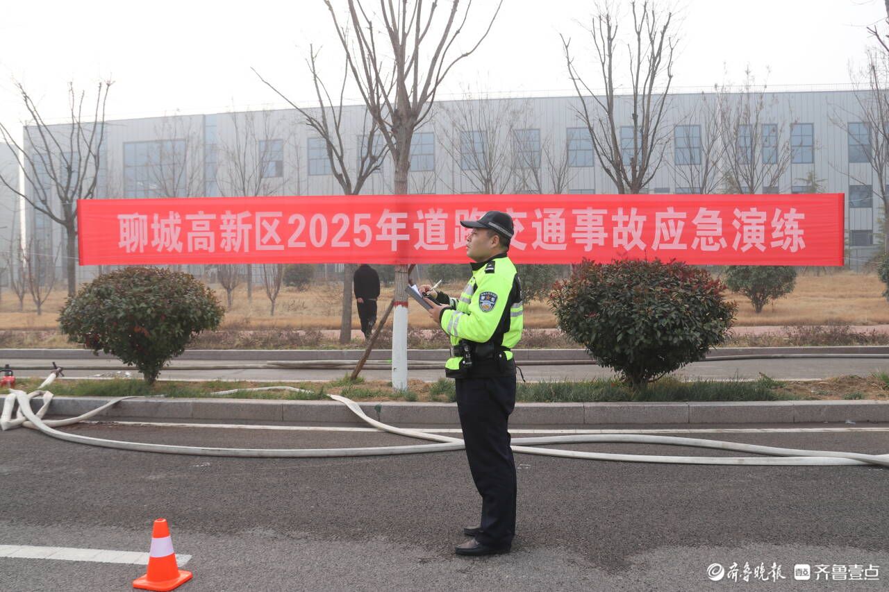 以练筑防,以“演”促练,为进一步健全道路交通事故应急处置机制,提升各部门协同作战能力,增强广大交通参与者的安全防范意识,12月19日,在聊城市高新区赣江路,一场公安交警、消防、应急、医疗急救、生态环境等多部门联动、全流程实战的危化品交通事故应急处置演练举行,各参演单位紧密配合、协同作战,展现出“硬核”处置能力。