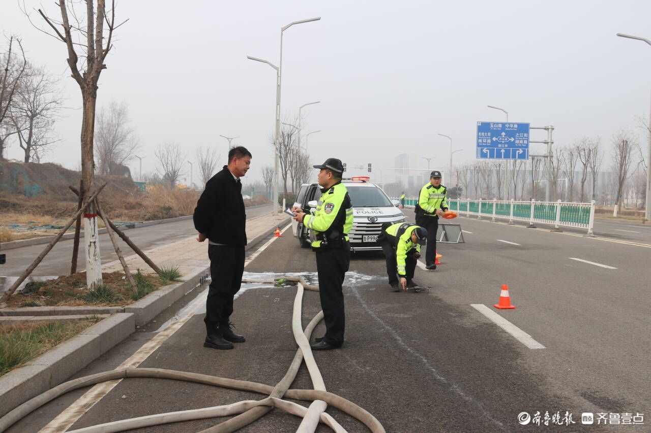 救援告一段落后,事故勘查、清障救援、环境测评等环节有序推进。警用无人机升空开展高空勘查,通过航拍技术快速生成现场实景记录和比例图,大幅提升勘查效率;事故中队民警同步开展驾驶人询问、呼气式酒精检测等调查工作,细致提取路面痕迹、车体痕迹等关键证据。鲁西应急救援中心的倒罐车随后入场,在消防人员监护下完成罐体内残留汽油的安全输转,清障救援队伍则迅速清理现场、拖离事故车辆,快速恢复道路通行条件。高新区生态环境分局工作人员携带专业设备,对现场空气、土壤等进行采样检测,全面评估污染影响,确保环境安全。