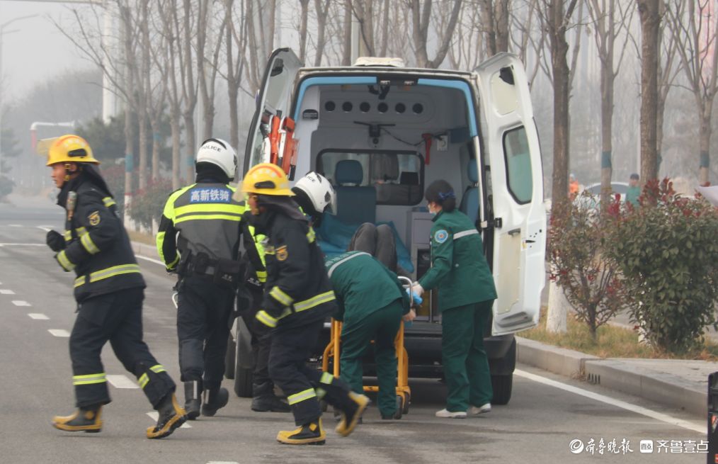 在消防救援人员成功救出被困驾驶人的瞬间,聊城市中心医院120救护车疾驰而至。医护人员与消防救援人员默契配合,快速完成伤员包扎固定,将伤者平稳抬上救护车,在高新区交警铁骑护航下全速前往医院救治。