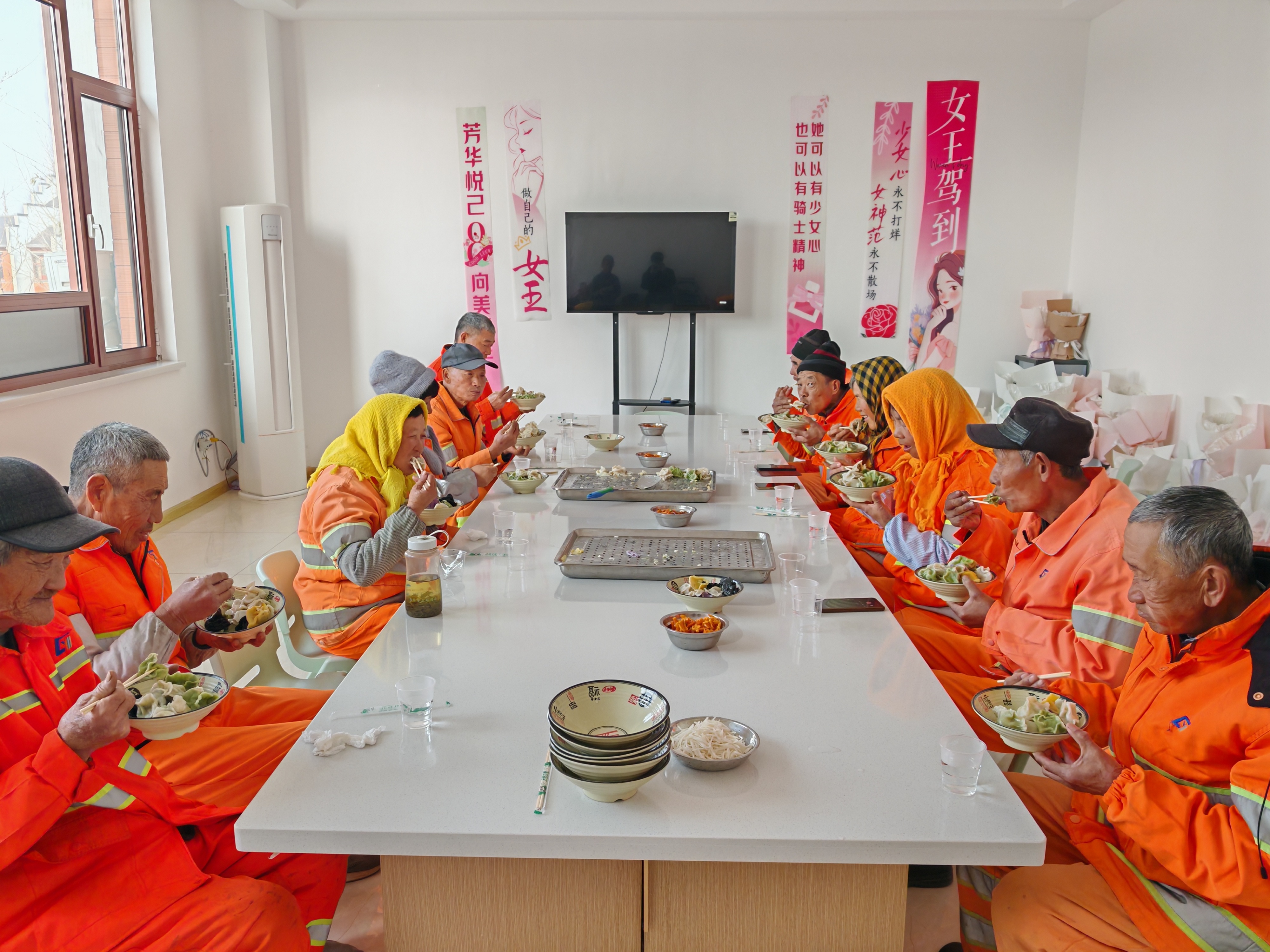 活动当天,共富茶食工坊内暖意融融。巾帼志愿者们早早聚集在一起,分工协作,和面、调馅、擀皮、包饺……动作娴熟,笑语盈盈。随着热气腾腾的抹茶饺、茶饺子陆续出锅,茶香也随之弥漫开来。环卫工人们结束了一上午的清扫工作,陆续来到工坊。大家围坐一堂,品尝着独具海青风味的爱心饺,脸上洋溢着幸福的笑容。