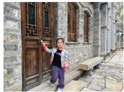 老门上的木格子窗户,和我们家的不一门框上还刻着小小的花纹,“像小花朵一样!”