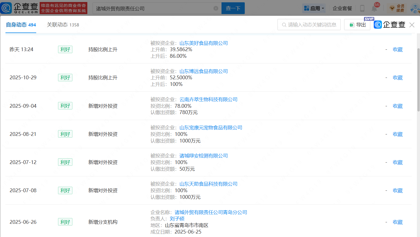 此外,今年以来诸城外贸对外投资动作频频。除投资山东美好食品、山东博远食品外,6月份以来,诸城外贸还投资了云南卉萃生物科技有限公司(下称“云南卉萃”)、山东宠康元宠物食品有限公司(下称“山东宠康元”)、诸城绿安检测有限公司(下称“诸城绿安检测”)、山东天助食品科技有限公司(下称“山东天助食品”)。