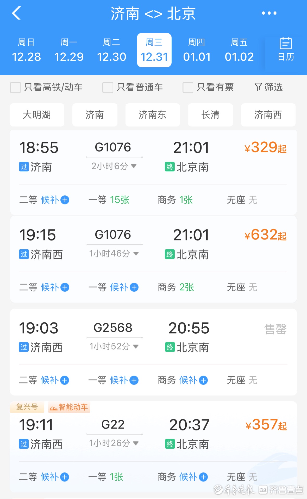 12月19日,记者在12306平台搜索发现,以济南为出发地,12月31日及1月1日到达北京、南京、上海、青岛、杭州等城市的部分车次车票已经“一票难求”。