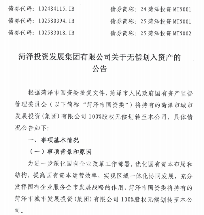 菏泽投资集团表示,截至目前,本次资产无偿划转事项尚未完成相关工商变更登记。本次无偿划入资产不构成重大资产重组,不会对公司治理、生产经营、财务状况及偿债能力产生不利影响,菏泽城投集团并入公司合并报表。
