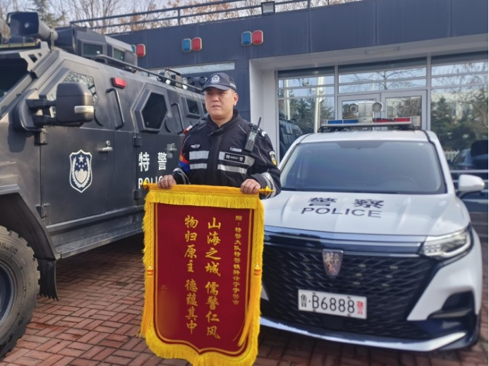 “谢谢警察同志,帮我找回手机。”12月19日,烟台游客张先生将一面绣有“山海之城 儒警仁风 物归原主 德蕴其中”的锦旗邮寄到青岛崂山公安分局特警大队,以表达对铁骑队员徐宁宁的感谢之情。