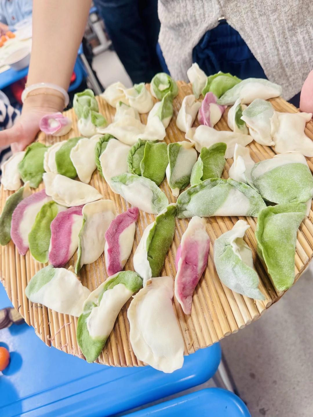 包饺子环节堪称“欢乐值拉满”!家长志愿者们早已备好食材,翠绿的菠菜汁面团、粉嫩的胡萝卜汁面团,还有鲜香的白菜猪肉馅、韭菜鸡蛋馅,整齐摆放在课桌上。“左手托面皮,右手舀馅料,对折后慢慢捏花边~”家长们耐心示范,萌娃们学得有模有样。有的小朋友小心翼翼舀馅,生怕漏出来;有的大胆创新,把饺子捏成星星、花朵形状;还有的合作分工,你擀皮我包馅,虽然动作略显笨拙,但每个饺子都承载着满满的童趣。彩色面团更是成了“创意神器”,红、绿、黄三色水饺在案板上排起长队,宛如一道道彩虹。