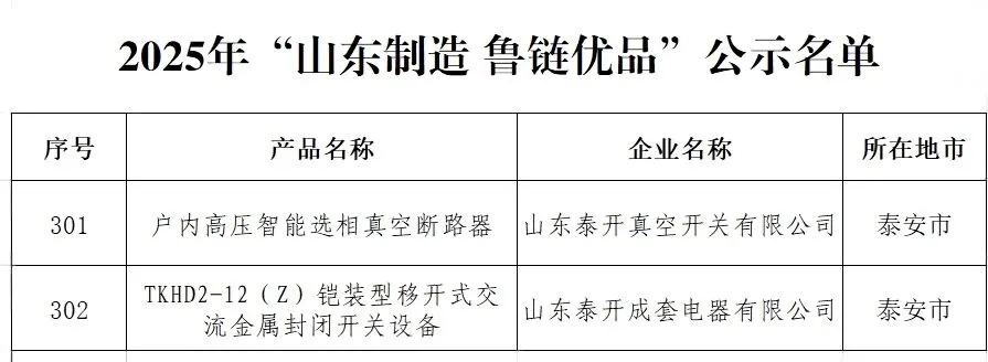 近日,山东省工业和信息化厅公示2025年“山东制造·鲁链优品”第一批入选产品名单,山东泰开成套电器有限公司的TKHD2-12(Z)铠装型移开式交流金属封闭开关设备、山东泰开真空开关有限公司的户内高压智能选相真空断路器,凭借卓越的产品品质、领先的技术实力和稳定的供应能力成功入选。