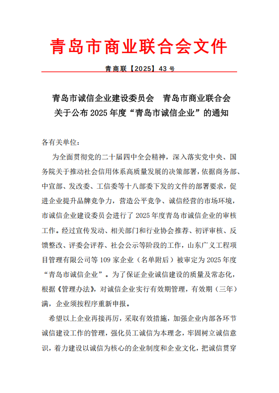 开投集团旗下12家企业荣获2025年度“青岛市诚信企业”荣誉称号