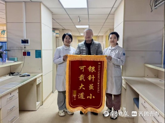“针扎下去不到两分钟,老父亲就醒了,中医急救太厉害了!”近日,患者家属孙先生将一面印着“银针虽小 可载大道”字样的锦旗送到了烟台市中医医院。一周前,86岁的孙老先生在该院就诊结束,准备离开医院时突发晕厥,命悬一线。正在颈肩腰腿痛治疗区为患者做治疗的医生张丹,巧用针灸为老人进行醒神开窍、调畅气机,老人很快转危为安。
