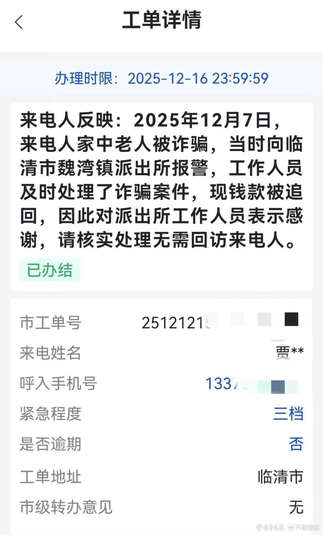 12月15日,临清市公安局魏湾派出所收到一份特殊的12345工单——它不是投诉或求助,而是一封温暖的“表扬信”。工单中写道:“警察同志帮我及时处理了诈骗案件,现钱款被追回,因此对派出所工作人员表示感谢!”