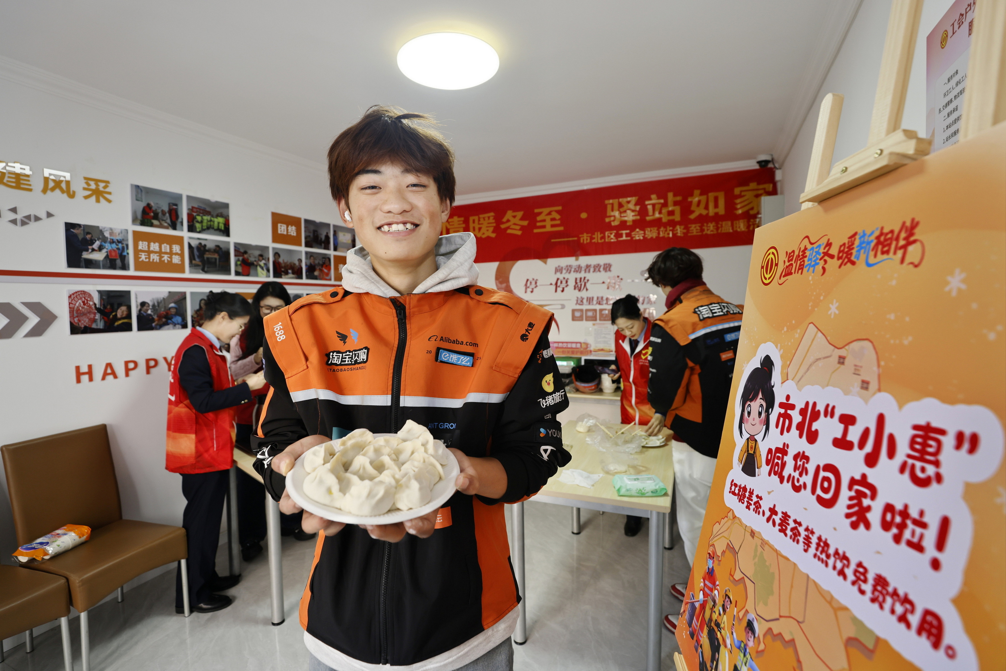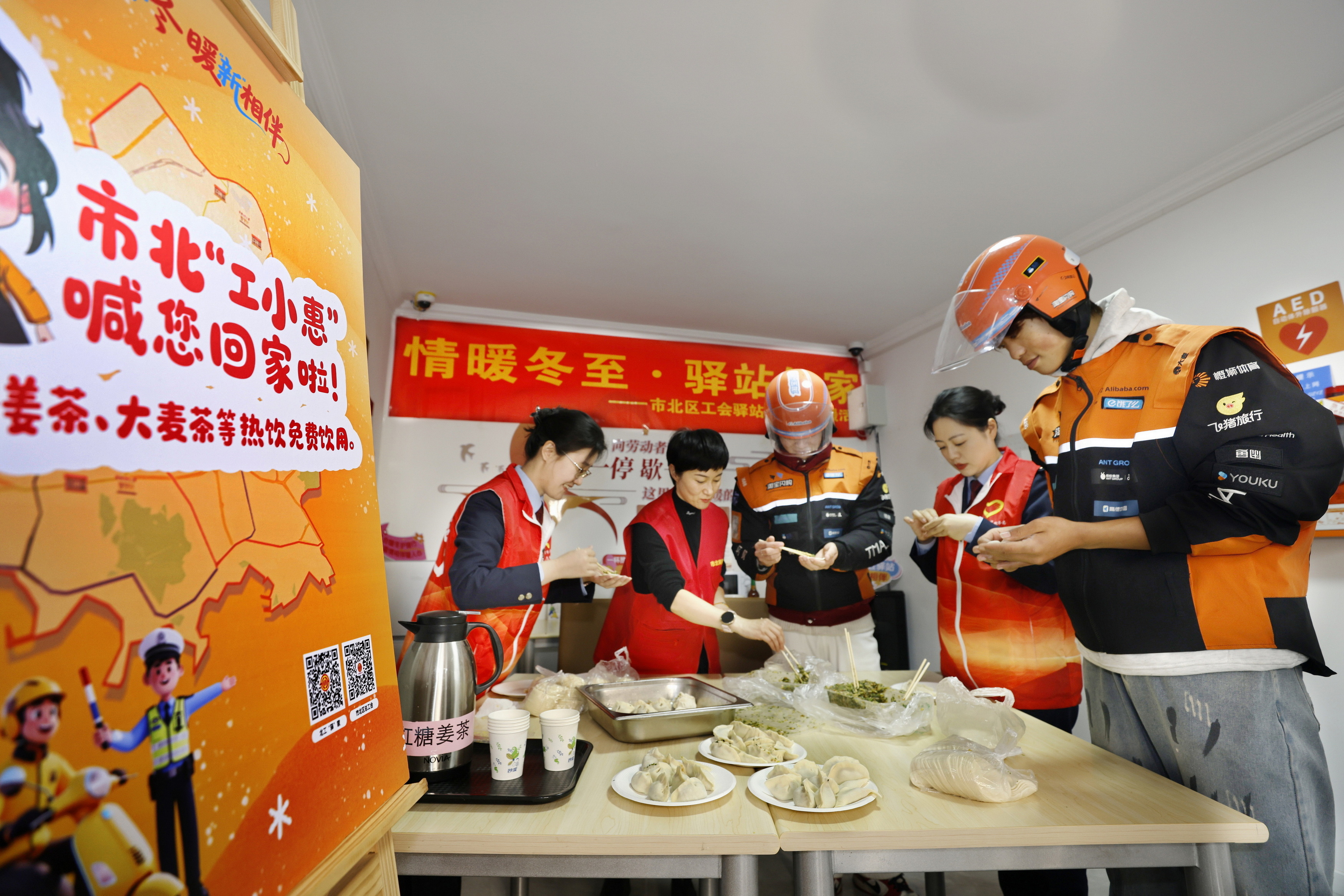连日来,青岛市市北区总工会组织青年志愿者在各工会驿站开展冬季“情暖冬至 驿站如家”志愿服务活动,为环卫工人、快递小哥等户外劳动者送健康体检,并开展包饺子活动。