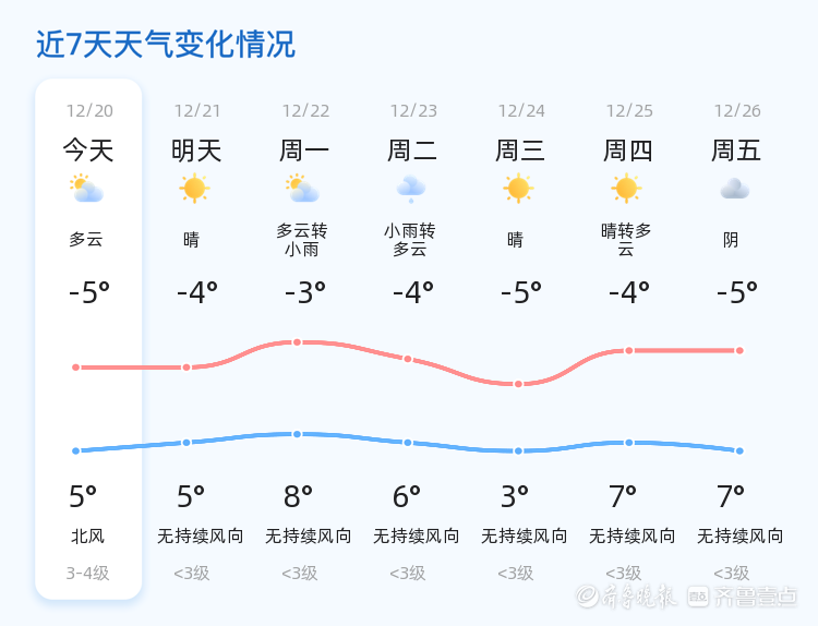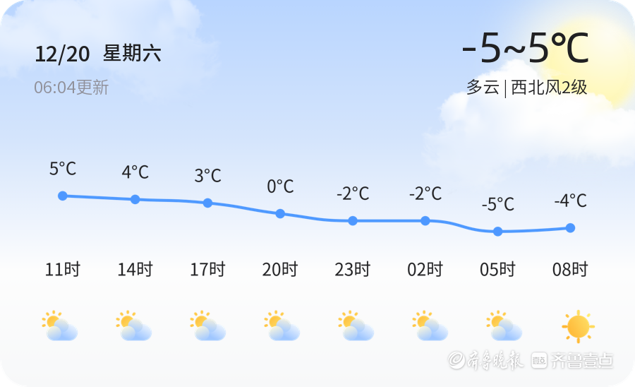 明天12月21日,星期日,潍坊市天气将转为晴朗,与今日的多云天气形成对比。温度范围仍为-4℃至5℃,风力有所减弱,为无持续风向,小于3级。市民朋友们可以趁着好天气进行户外活动,享受冬日的阳光。