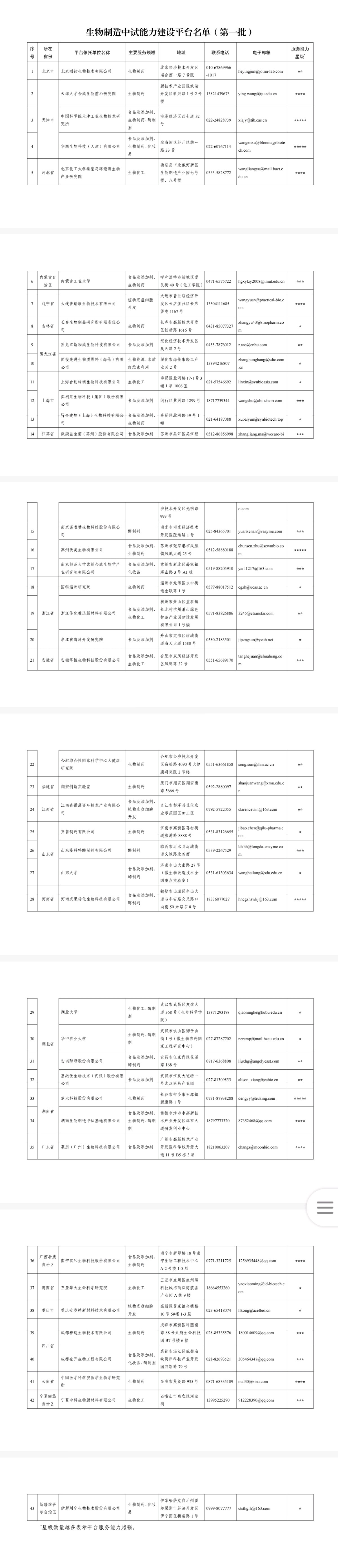 记者从工业和信息化部网站了解到,经省级主管部门推荐、专家评价、面向社会公示等程序,首批生物制造中试能力建设平台名单公布,全国共有43家平台入选,其中山东齐鲁制药有限公司(生物制药方向)、山东隆科特酶制剂有限公司(酶制剂方向)、山东大学(食品及添加剂、酶制剂方向)入选。
