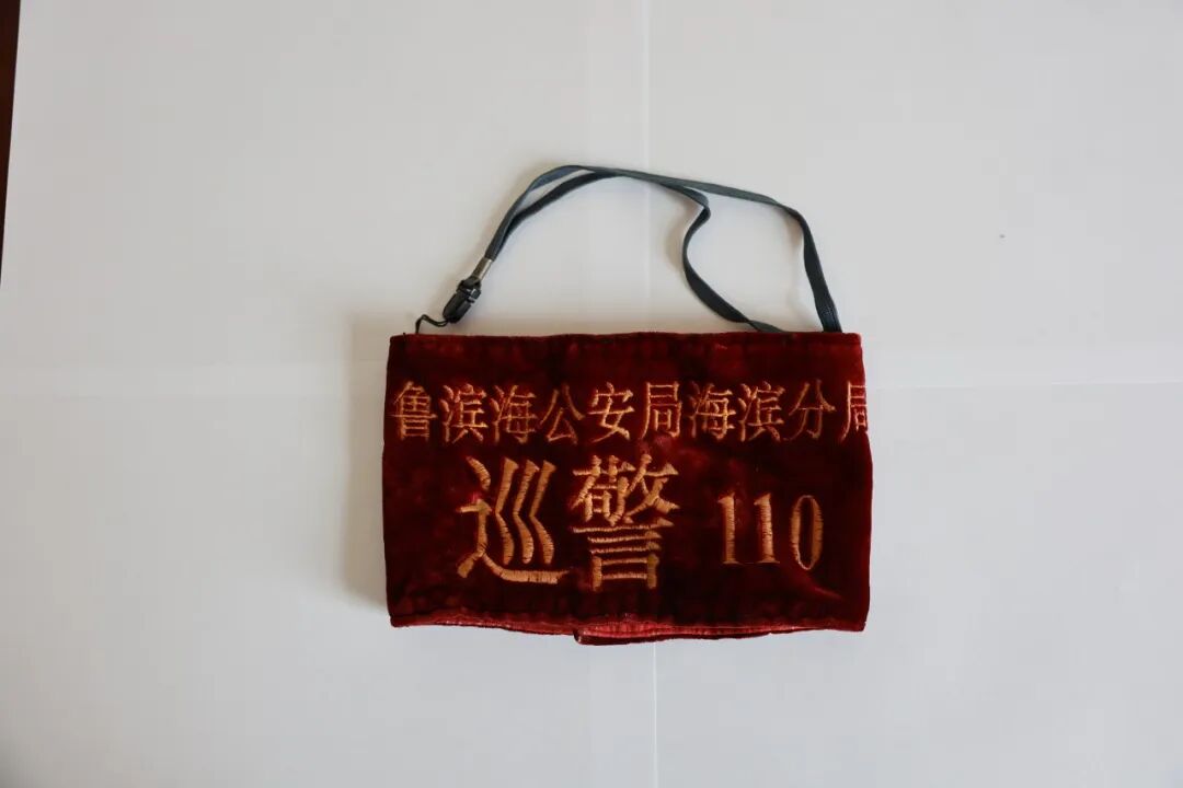 这件袖章是2000年配发至滨海公安局海滨分局巡逻警察大队的 “巡警110” 红袖标,主体为酒红色绒布材质,绣有 “鲁滨海公安局海滨分局巡警110”字样,该袖章使用至2006年,换装后改为佩戴胸牌,是早期110巡警执勤装备的实物见证,当时民警执勤巡逻时佩戴彰显执法威严,便于群众报警求助。