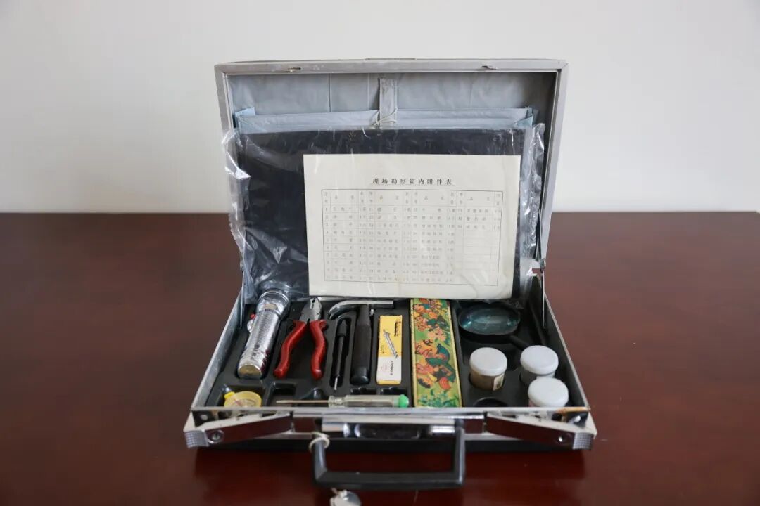 这件现场勘查包是1985 年胜利油田公安处定制的,主体为铝合金箱体配帆布内衬,适配油田野外勘查的耐磨、抗腐蚀需求。1987年10月23日胜坨镇盗油案中,民警携此包开展现场工作,凭借包内工具提取的物证锁定5人盗油团伙。该包在1985至1992年间配发至公安刑事技术单位,在各类刑事案件现场勘查工作中发挥了重要作用,是油田公安打击犯罪、守护油区的实物见证。