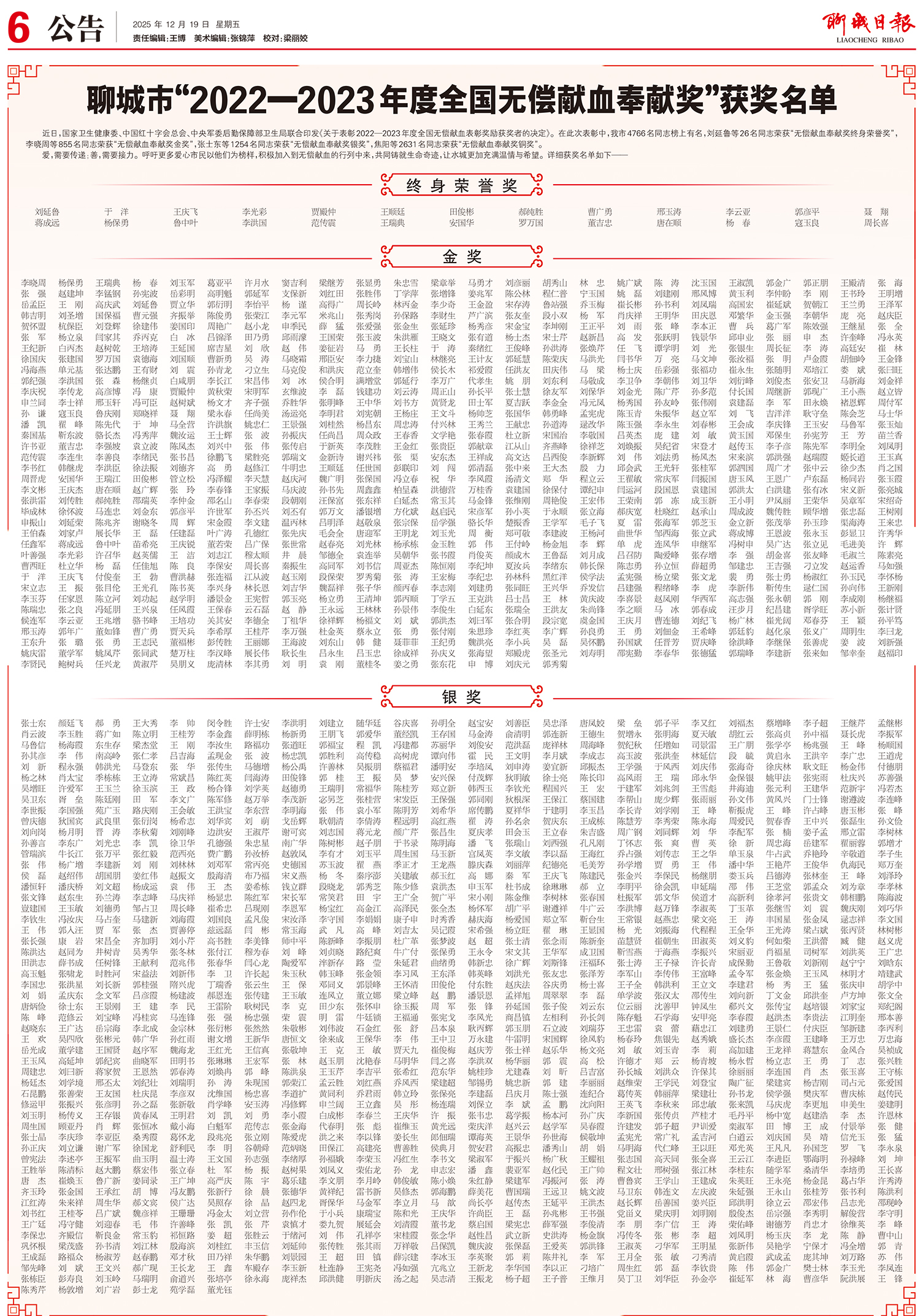 聊城市“2022—2023年度全国无偿献血奉献奖”获奖名单