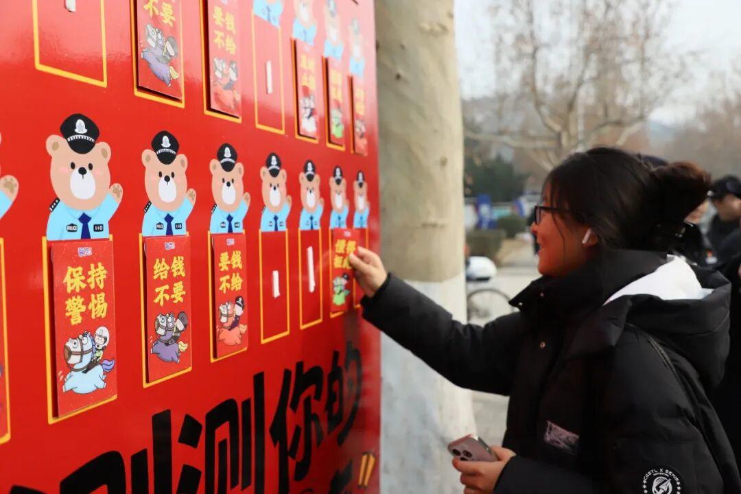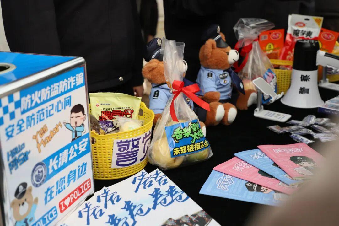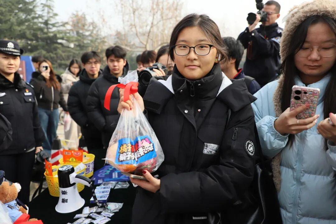 与此同时,室外还设置了《测测你的反诈灵敏度》互动问答环节。长约3米的展板上贴满了送给同学们的“警觉”反诈红包,摊位上整齐摆放的警小熊、零食、水果、冰箱贴等物品,瞬间吸引了大家的目光,现场很快被围得水泄不通,大家都想讨个“警觉”红包,挑战一下反诈答题,获得一份丰富味蕾、能量满满的奖品。
