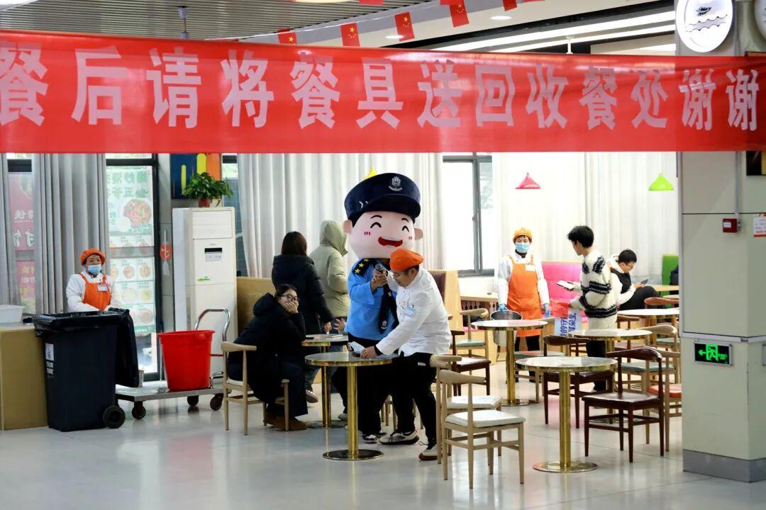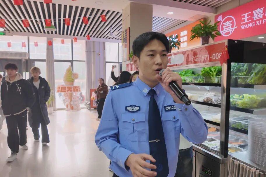 11点50分,食堂里坐满了用餐的同学,《最炫民族风》前奏突然响起,熟悉的旋律让同学们好奇地四处寻找歌声来源。此时,一位身着食堂工作人员服装的同学在警察玩偶的簇拥下拿起话筒,惊艳的嗓音瞬间点燃现场气氛,“居然是快闪!”大家纷纷掏出手机录像、拍照,记录这精彩时刻。“火辣辣的歌谣是我们的期待,一路边走边唱才是最自在!”济南市公安局长清分局刑侦大队反诈辅警李佳璇的闪现掀起新一轮的热潮,现场欢呼声此起彼伏。