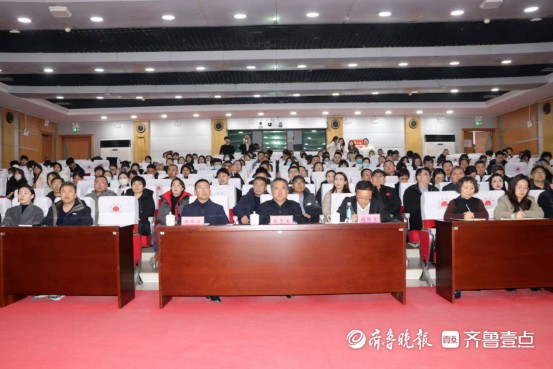 宣传部、工会及各分会代表,山东省高校黄大年式教师团队、李风海能源化工工作室成员,后勤管理处医疗保健中心工作人员,药学院、体育与健康学院师生代表聆听报告会。