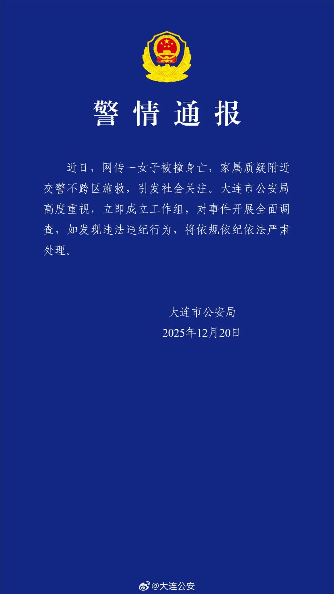 12月20日大连市公安局发布警情通报近日网传一女子被撞身亡家属质疑附近交警不跨区施救引发社会关注大连市公安局高度重视立即成立工作组对事件开展全面调查如发现违法违纪行为将依规依纪依法严肃处理