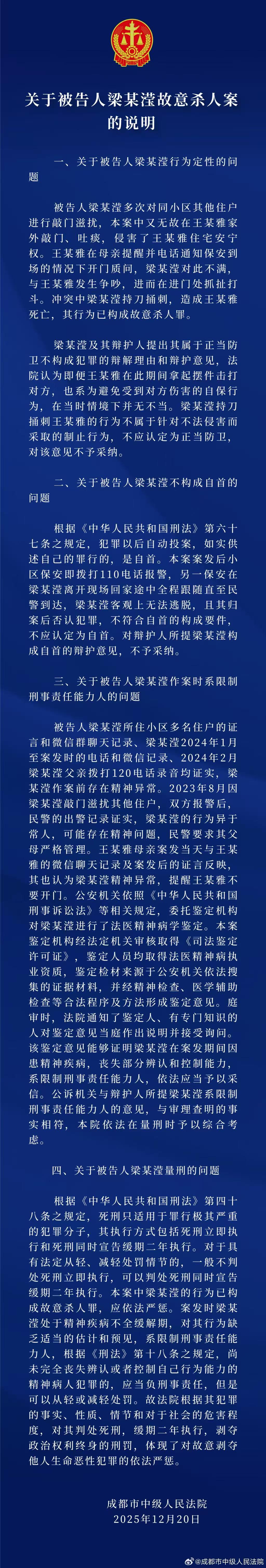 2025年12月20日,四川省成都市中级人民法院一审公开宣判被告人梁某滢故意杀人一案,对被告人梁某滢以故意杀人罪判处死刑,缓期二年执行,剥夺政治权利终身。